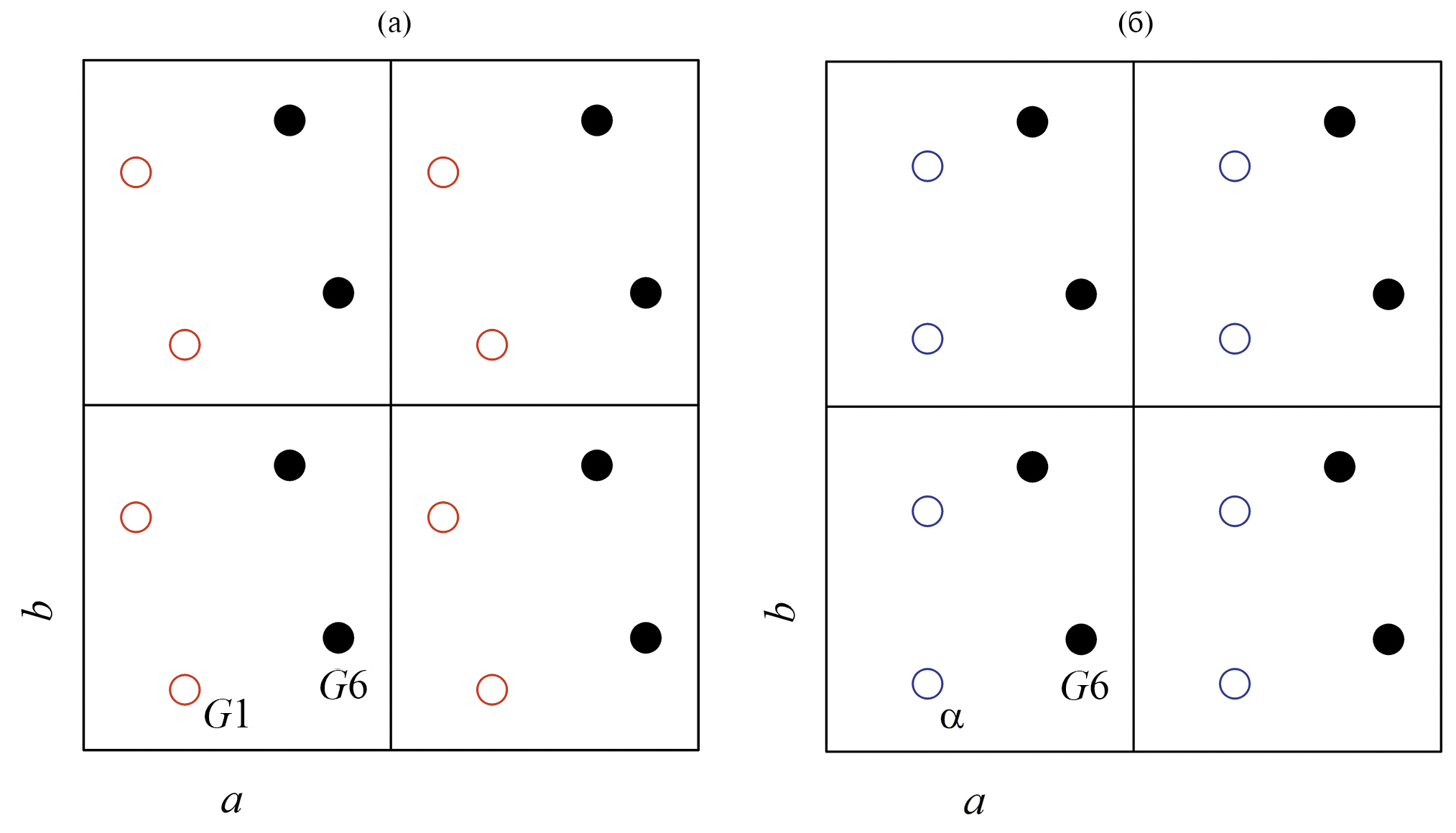 Рис. 1. Взаимное положение плоскостей 1 и 6 атомов железа в структуре цементита (а) и плоскостей 6 цементита и 1 феррита на межфазной границе