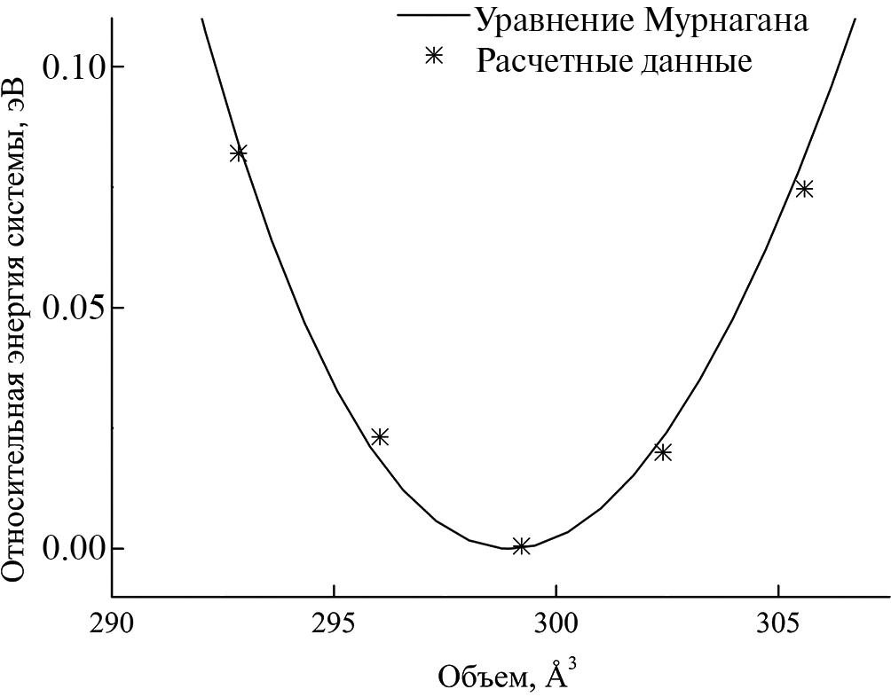 Параметры решетки определяли путем объемной оптимизации структуры суперячейки. Для ячейки с ОСБ сначала варьировали объем системы при постоянных значениях параметра решетки c и отношении a / b (рис. 3). На оси ординат на рис. 3 отложена относительная энергия Ei – E0, где E0 – самое низкое значение энергии из всех рассмотренных вариантов, а Ei – значение энергии, соответствующее конкретному значению объема. Согласно уравнению Мурнагана, наименьшей энергии отвечает объем системы 298.9 Å3 (–6% от начального): a1 = 4.416 Å, b1 = 4.958 Å, c1 = 13.652 Å.