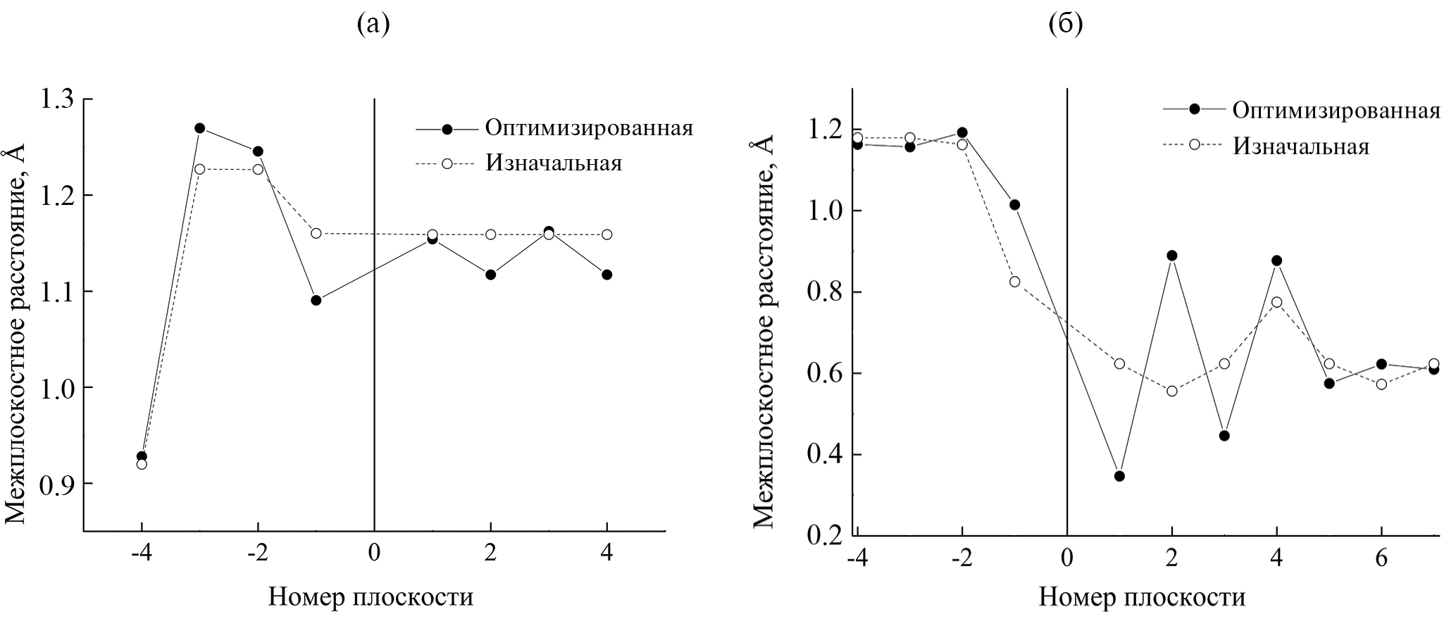 Рис. 4. Графики зависимости межплоскостного расстояния вблизи межфазной границы для изначальной структуры и структуры после проведения оптимизации ОСБ (а) и ОСИ (б). Отрицательные номера соответствуют плоскостям феррита, положительные – цементита.