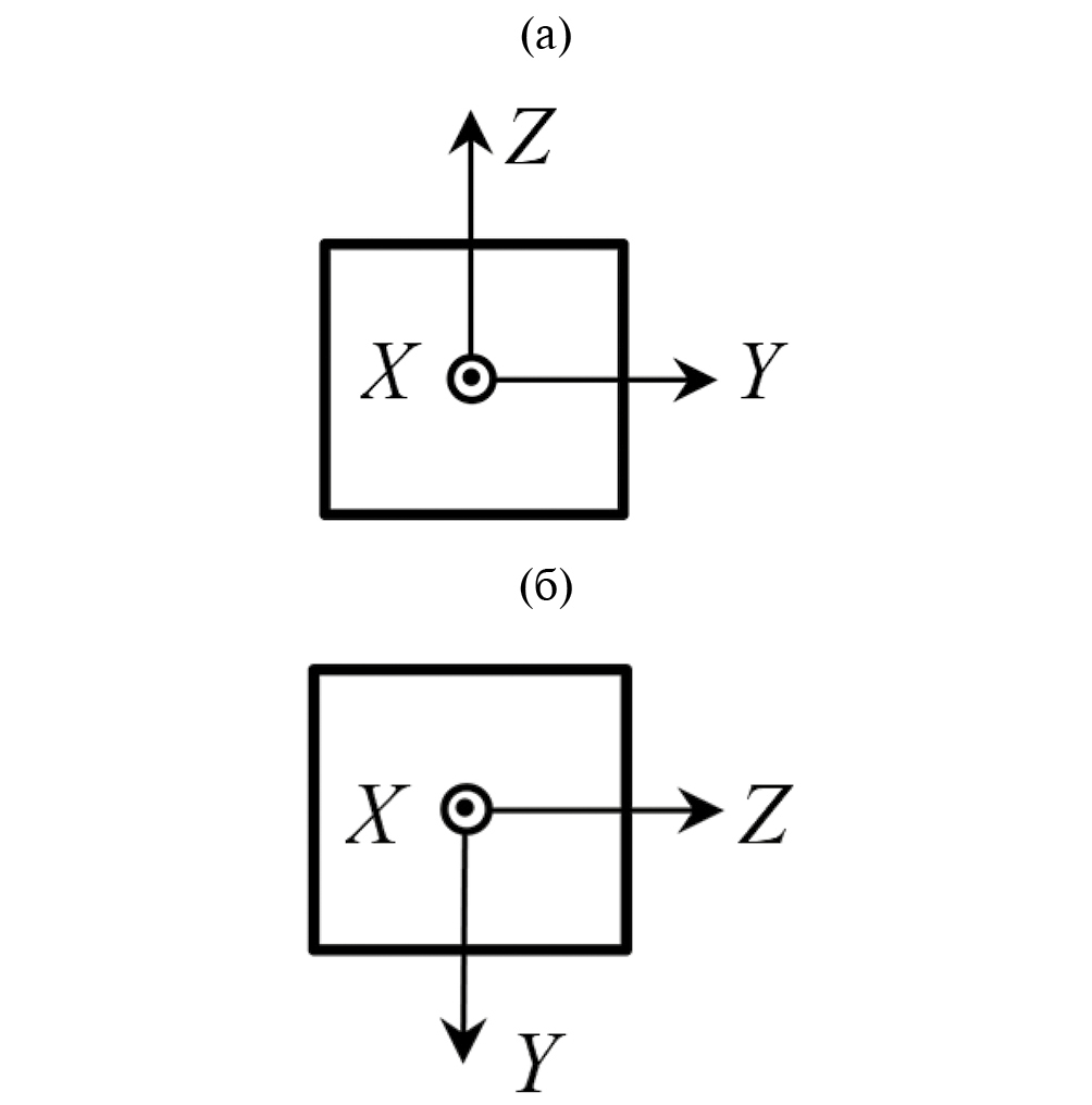 Рис. 1. Схема установки образцов X-срезов при проведении эксперимента. а – первое положение, б – второе положение.