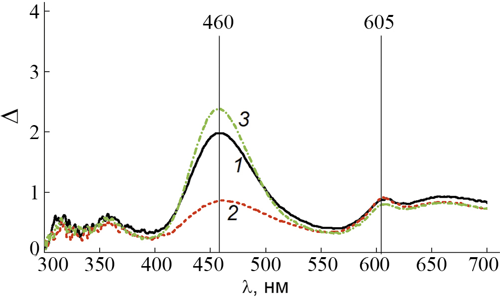 Для численной оценки дихроизма по измеренным спектральным зависимостям пропускания рассчитывалась степень дихроизма Δ [8]: