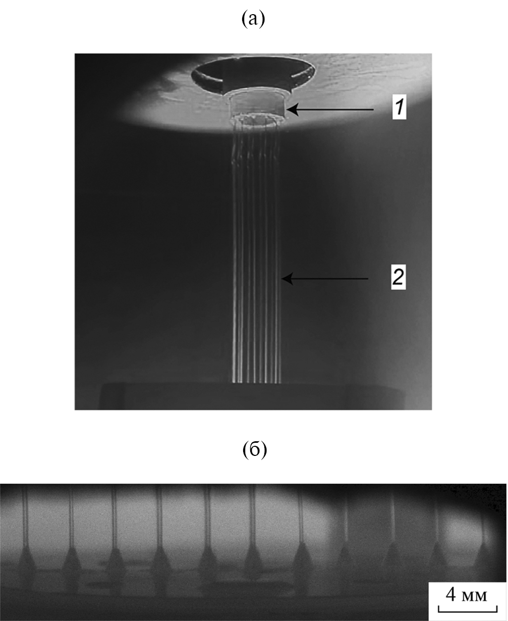 Выращивание волокон групповым методом [14] с использованием кругового или линейного расположения капилляров формообразователей (рис. 2) позволяет существенно повысить производительность метода и обеспечить реальное использование их в качестве армирующей компоненты в конструкционных композитных материалах.