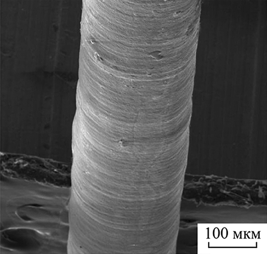Наиболее существенное влияние на прочность волокон оказывает наличие поверхностных дефектов, которые в первую очередь определяются шероховатостью поверхности [15]. При выращивании сапфировых волокон методом Степанова/EFG одним из главных факторов, влияющих на поверхностные качества волокна, является стабильность мениска расплава. Малый диаметр и объем мениска расплава под фронтом кристаллизации приводит к колебаниям сапфирового волокна в процессе его выращивания в восходящем газовом потоке тепловой зоны. Колебание волокна, находящегося в зацеплении с мениском расплава, возникает на длине 200–300 мм (чем меньше диаметр волокна, тем раньше возникает колебание) и при дальнейшем выращивании амплитуда колебания увеличивается, что приводит к изменению поперечного сечения и шероховатости поверхности волокна (рис. 4) и, как следствие, существенному снижению его прочности.