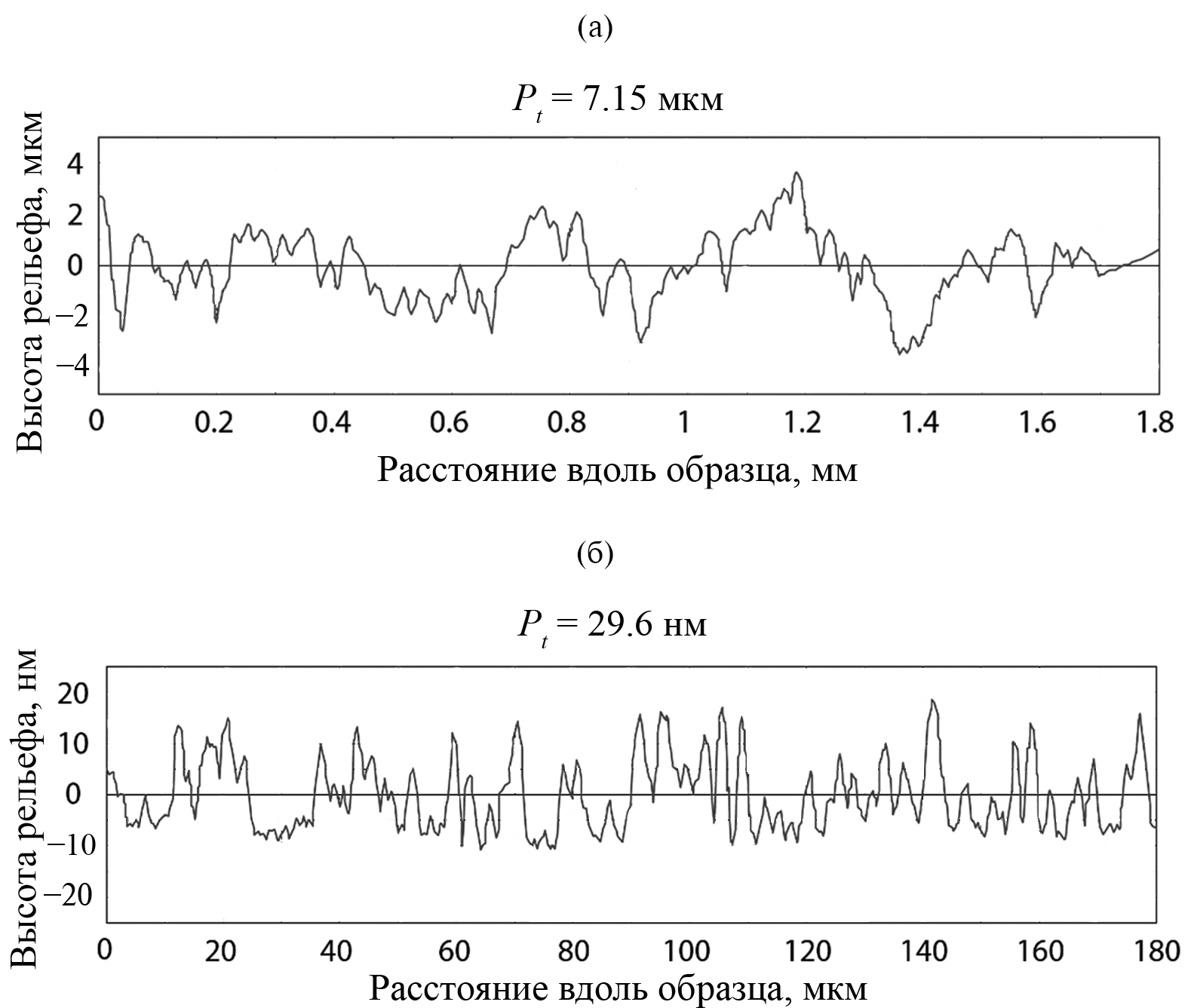 Рис. 6. Шероховатость поверхности сапфировых волокон, выращенных в обычном режиме (а) и с использованием системы стабилизации диаметра (б). Pt – сумма высоты наибольшего выступа и глубины наибольшей впадины рельефа поверхности.