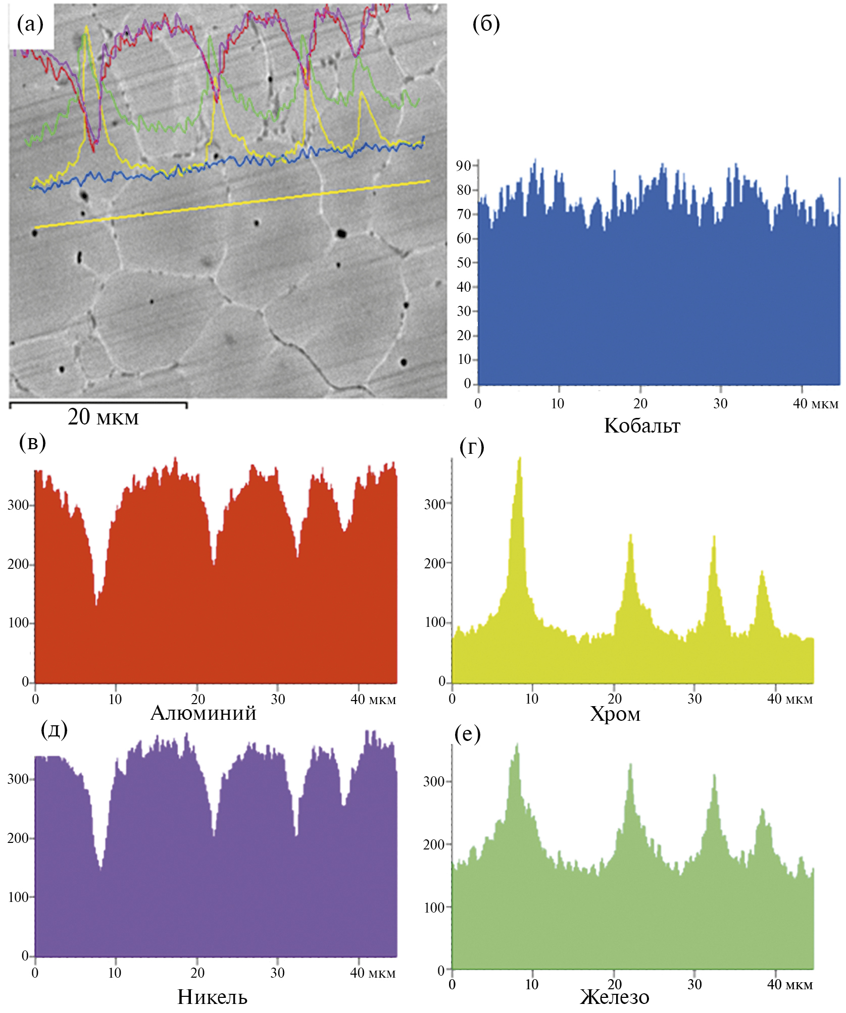 Рис. 2. Результаты микрорентгеноспектрального анализа участка образца ВЭС (а), выполненные методом “вдоль линии”; (б)–(е) – распределение вдоль указанной на рис. 2а линии интенсивностей характеристического рентгеновского излучения атомов Co (б), Al (в), Cr (г), Ni (д), Fe (е)