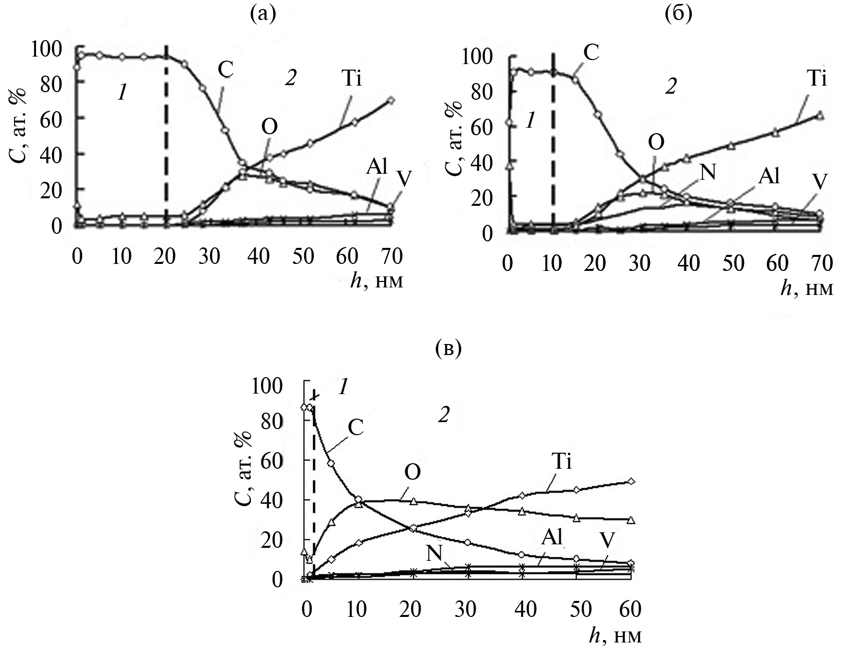 Исследования методом РФЭС показали, что после напыления пленка углерода имела толщину порядка 30–35 нм (рис. 1а). При этом поверхностный слой, содержащий углерод, можно разделить на два слоя. Слой 1, преимущественно состоящий из углерода, и слой 2 – переходный слой (рис. 1а). При этом за начало переходного слоя принималась глубина, начиная с которой концентрация углерода начинала снижаться, а концентрация титана, напротив, возрастать. К концу переходного слоя начинают проявляться легирующие элементы титанового сплава – алюминий и ванадий (рис. 1). При этом их концентрация невысока. Для алюминия она составляет 6 ат. %, а для ванадия 4 ат. %, что соответствует их концентрации в объеме сплава. Поскольку алюминий и ванадий начинают проявляться лишь к концу переходного слоя и, учитывая, что их концентрация по отношению к атомам титана невысока, можно предполагать, что основное влияние на формирование поверхностного слоя будут оказывать именно атомы титана. Глубина слоя 1 для исходной пленки составляет около 20 нм, а слоя 2 – около 50 нм (рис. 1а). В результате ионно-лучевого перемешивания происходит уменьшение толщины слоя с преимущественной концентрацией углерода и увеличение толщины переходного слоя (рис. 1б). Например, толщина слоя 1 уменьшается до порядка 10 нм. Наблюдаемые изменения в распределениях концентрационных профилей титана и углерода являются следствием процессов ионно-лучевого перемешивания, одним из механизмов которого является баллистическое перемешивание [7, 18]. Следует обратить внимание на наличие кислорода в переходной области в образцах как до, так и после ионно-лучевого перемешивания. Как будет показано ниже, наличие кислорода, в том числе в переходной области, и его высокая химическая активность к титану будут определять изменение концентраций элементов в условиях термического воздействия. По всей видимости, из-за высокой химической активности титана к кислороду ионная “чистка” поверхности не позволяет до конца избавиться от кислорода. Распределения элементов в образце после термического воздействия представлены на рис. 1в. Отметим, что слой с преимущественной концентрацией углерода, несмотря на то, что сохраняется, уменьшается до толщины менее 3–5 нм, практически с поверхности и с большими значениями концентрации (максимальная концентрация 40 ат. %) проявляется кислород, распределение титана начинается также с поверхности, и его концентрация растет с увеличением глубины.