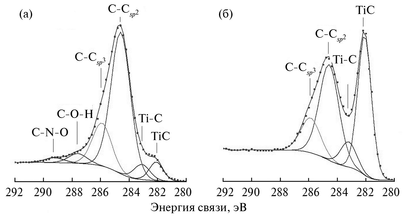 Анализируя РФЭ-спектр С1s (рис. 2) образца после термического воздействия можно сделать вывод о том, что химическое состояние углерода не отличается от состояния углерода после ионно-лучевого перемешивания [18, 19]. Оно описывается С–С-связями с sp2 - (284.6 эВ), sp3 - (286.0 эВ) гибридизацией валентных электронов, карбидом титана TiC (282.0 эВ) и карбидами титана промежуточного состава (283.2 эВ). Однако следует отметить, что состояние углерода, соответствующее карбидам титана, в этом случае начинает проявляться практически с поверхности. Например, на глубине порядка 5 нм на С1s-спектре уже отчетливо проявляются составляющие, характерные для Ti–C-связей (рис. 2а). По мере увеличения глубины анализируемого слоя интенсивность этих составляющих, а значит и концентрация карбидов титана, увеличивается (рис. 2б).