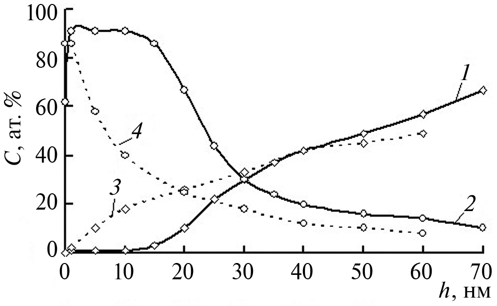 Если на отдельном графике отобразить профили распределений титана и углерода в образцах до (профили 1 и 2 соответственно) и после термического воздействия (профили 3 и 4 соответственно), то наблюдается существенный сдвиг данных профилей к поверхности после термического воздействия (рис. 4). Это может свидетельствовать о том, что дополнительный нагрев образцов с перемешанной ионной имплантацией пленкой углерода не приводит к диффузии углерода в более глубокие слои. Напротив, концентрация углерода снижается. Если считать среднее значение концентрации углерода в анализируемом слое, то она уменьшается от порядка 50 ат. % до порядка 38 ат. %. Аналогичные выводы можно сделать и по азоту (рис. 5) – средняя концентрация азота снижается более чем в два раза. Как уже отмечалось выше, концентрация кислорода после термического воздействия возрастает (рис. 6), причем так, что профиль распределения сдвинут к поверхности (рис. 6, профиль 2), а его средняя концентрация возрастает более чем в два раза – от порядка 14 ат. % до порядка 29 ат. %.