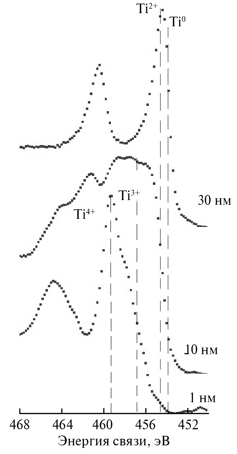 Данные предположения подтверждаются РФЭ-спектрами Ti2p (рис. 7). Вид спектра Ti2p свидетельствует о том, что в тонком поверхностном слое до глубины порядка 10 нм преобладают оксиды титана с наивысшей степенью окисления Ti4+ – 459.2 эВ и Ti3+ – 456.8 эВ [20, 21]. При приближении к переходной области пленка/подложка преобладает форма титана со степенью окисления Ti2+ – 454.3 эВ [21, 22]. Следует заметить, что указанные величины позиций максимума Ti2p3/2 не являются абсолютными значениями, они зависят, например, от структурной модификации оксида титана и ряда других факторов. Но в любом случае химический сдвиг спектра Ti2p3/2 при переходе от одной степени окисления к другой настолько велик, что валентность металла в оксиде может быть достаточно точно идентифицирована. Таким образом, можно определенно утверждать, что титан в тонком поверхностном слое до глубины порядка 10 нм находится в состоянии Ti4+ и Ti3+, что может соответствовать оксидам титана TiO2, Ti2O3 или оксидам титана с нестехиометрическим составом, а в межфазной области – Ti2+.