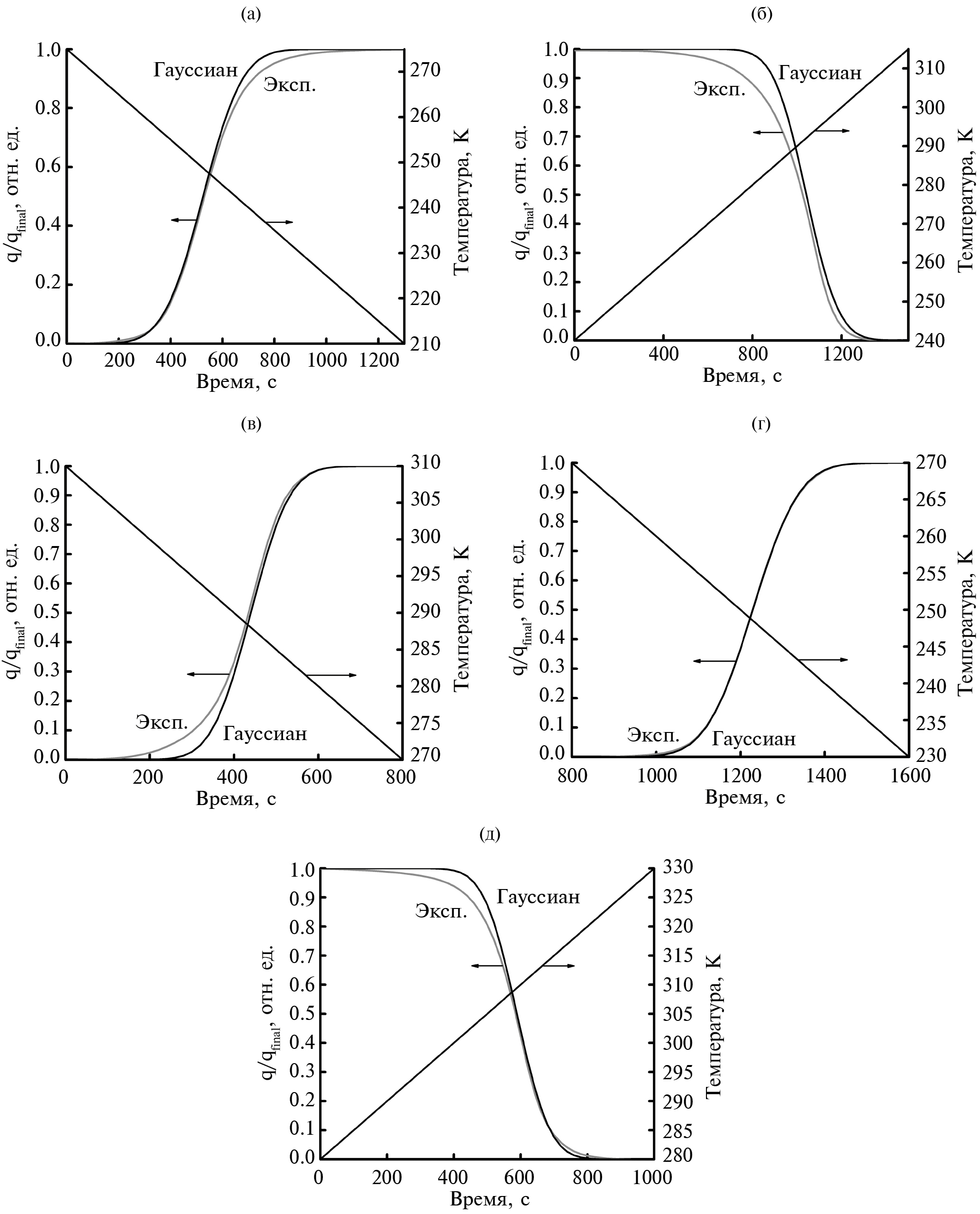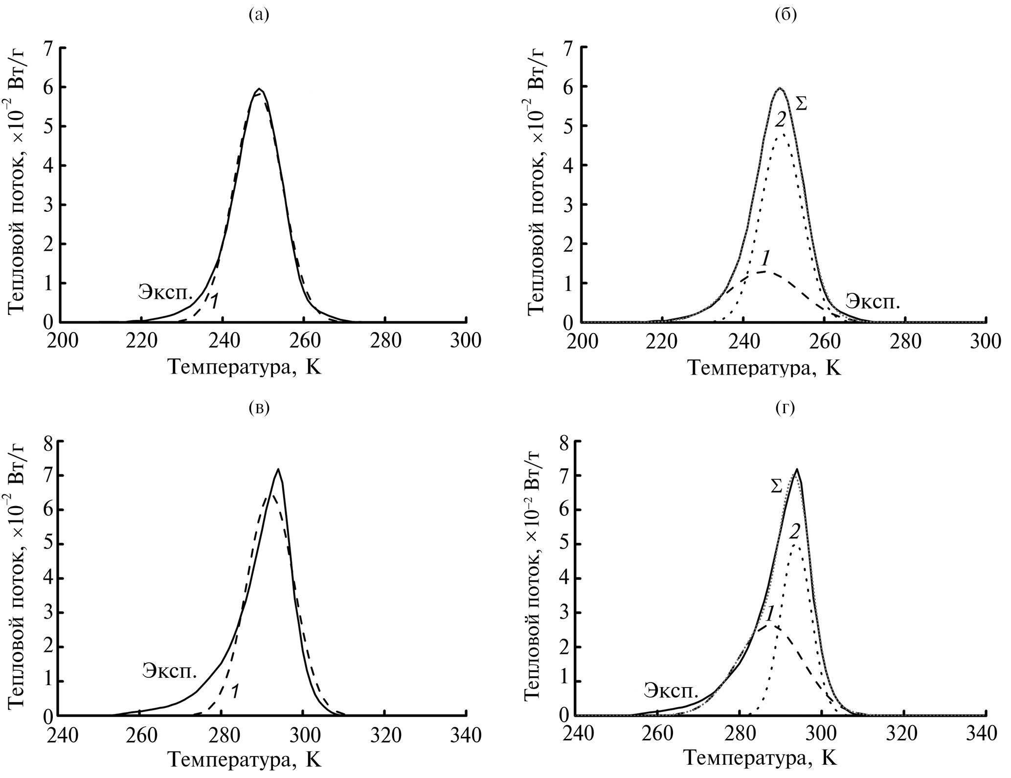 Для наноструктурированных образцов при их охлаждении [10, рис. 5] два наблюдаемых положительных калориметрических пика qпик1 = = 7.9 Дж/г и qпик2 = 4.7 Дж/г [10, табл. 2] целесообразно аппроксимировать тремя гауссианами, т.е. рассматривать как трехстадийный процесс (рис. 2б, табл. 1) с положительными тепловыми эффектами (qГ1 = 7.8 Дж/г, qГ2 = 2.5 Дж/г и qГ3 = = 2.1 Дж/г). Отметим, что величина qГ1 близка к величине qпик1, а сумма величин qГ2 и qГ3 близка к величине qпик2. Наблюдаемый для наноструктурированных образцов при их нагреве [10, рис. 5] отрицательный калориметрический пик qпик = = –18.4 Дж/г [10, табл. 2] целесообразно описать двумя гауссианами (рис. 2г, табл. 1) с отрицательными тепловыми эффектами (qГ1 = –13.2 Дж/г и qГ2 = –5.2 Дж/г), сумма которых (–18.4 Дж/г) соответствует qпик.