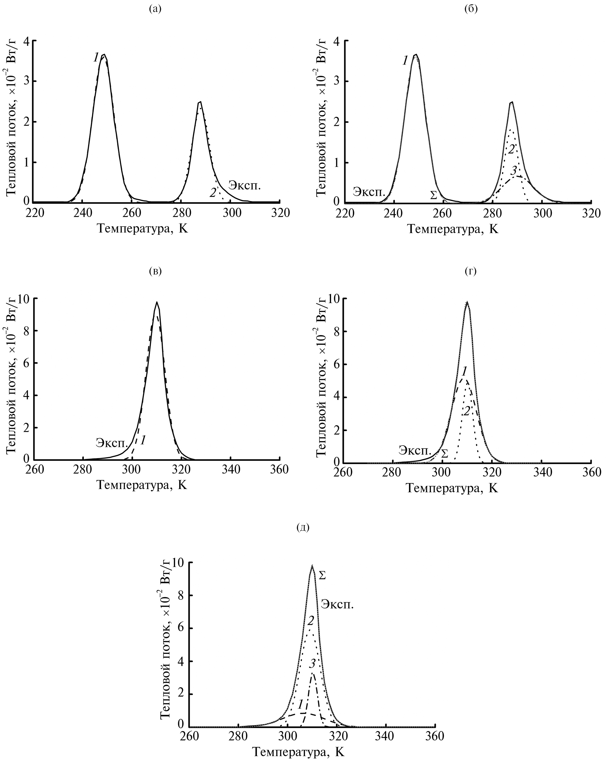 Рис. 1. Аппроксимация гауссианами (методология [14, 15]) калориметрических спектров (пиков) из работы [10, рис. 4]. Номер гауссина на рисунке сответствует номеру в табл. 1, “Σ” – сумма гауссианов (серая пунктирная линия), “Эксп.” – экспериментальная кривая (сплошная черная кривая)