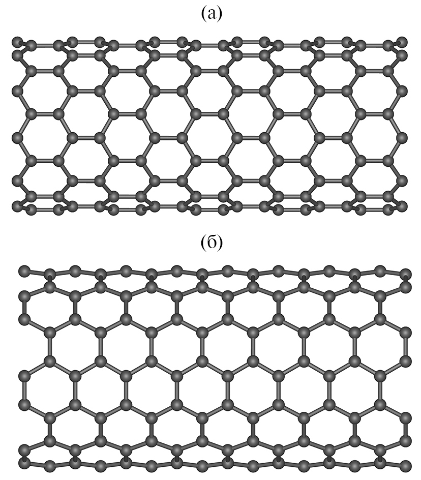 Рис. 1. Атомная структура бездефектных УНТ (11, 0) (а) и (7, 7) (б)