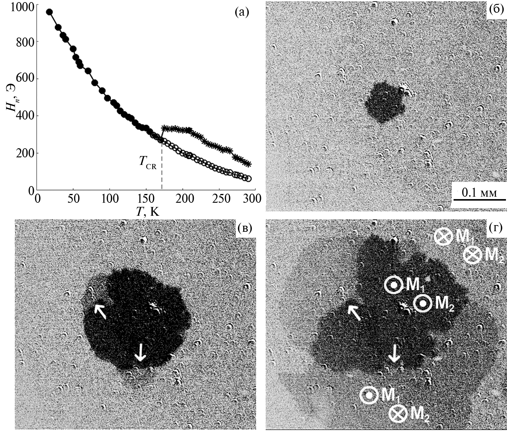 При комнатной температуре наблюдаются три уровня интенсивности отраженного света, соответствующие различным направлениям намагниченности в слоях. Каждый слой образца перемагничивается независимо от другого. Сначала домены зарождаются и растут в одном слое, затем после увеличения поля в другом. Центры зарождения новых доменов в слоях не совпадают. Исходя из анализа интенсивности отраженного света [19] был сделан вывод, что сначала перемагничивается верхний слой, затем нижний. На рис. 1а приведена зависимость поля зарождения доменов от температуры. Видно, что при комнатной температуре разница между полем зарождения в верхнем и нижнем слоях около 80 Э. С понижением температуры поля зарождения доменов в верхнем и нижнем слоях постепенно увеличиваются. Однако разница полей зарождения остается примерно равной 80–100 Э. При температуре TCR = 170 К картина перемагничивания резко изменяется. На рис. 1б–г проиллюстрировано зарождение и последующий рост новых доменов в поле 270 Э. Сначала появляется новый домен сразу в двух слоях: на рис. 1б различимы два уровня интенсивности – светлый и темный, которые соответствуют одинаковым направлениям намагниченности в слоях вниз или вверх. Затем доменная граница в верхнем слое опережает границу в нижнем слое – на рис. 1в–г наблюдается промежуточный уровень интенсивности, соответствующий противоположному направлению векторов намагниченности в слоях. Поскольку скорости доменных границ в верхнем слое значительно выше, они быстро заметают весь образец. В нижнем слое границы остаются в местах, где граница верхнего слоя их опередила. Примеры участков таких границ указаны стрелками. Для дальнейшего роста нижнего домена требуется увеличение магнитного поля примерно на 30 Э. При понижении температуры схожая картина сохраняется, с той лишь разницей, что скорость доменной границы в верхнем слое понижается, а в области, где оба слоя перемагничены, становится больше. При температуре ниже 160 К не наблюдается промежуточный уровень интенсивности, т.е. оба слоя становятся связанными и перемагничиваются одновременно. Зависимость поля зарождения доменов от температуры плавно продолжает расти и продлевает зависимость, полученную для поля зарождения доменов в верхнем слое.