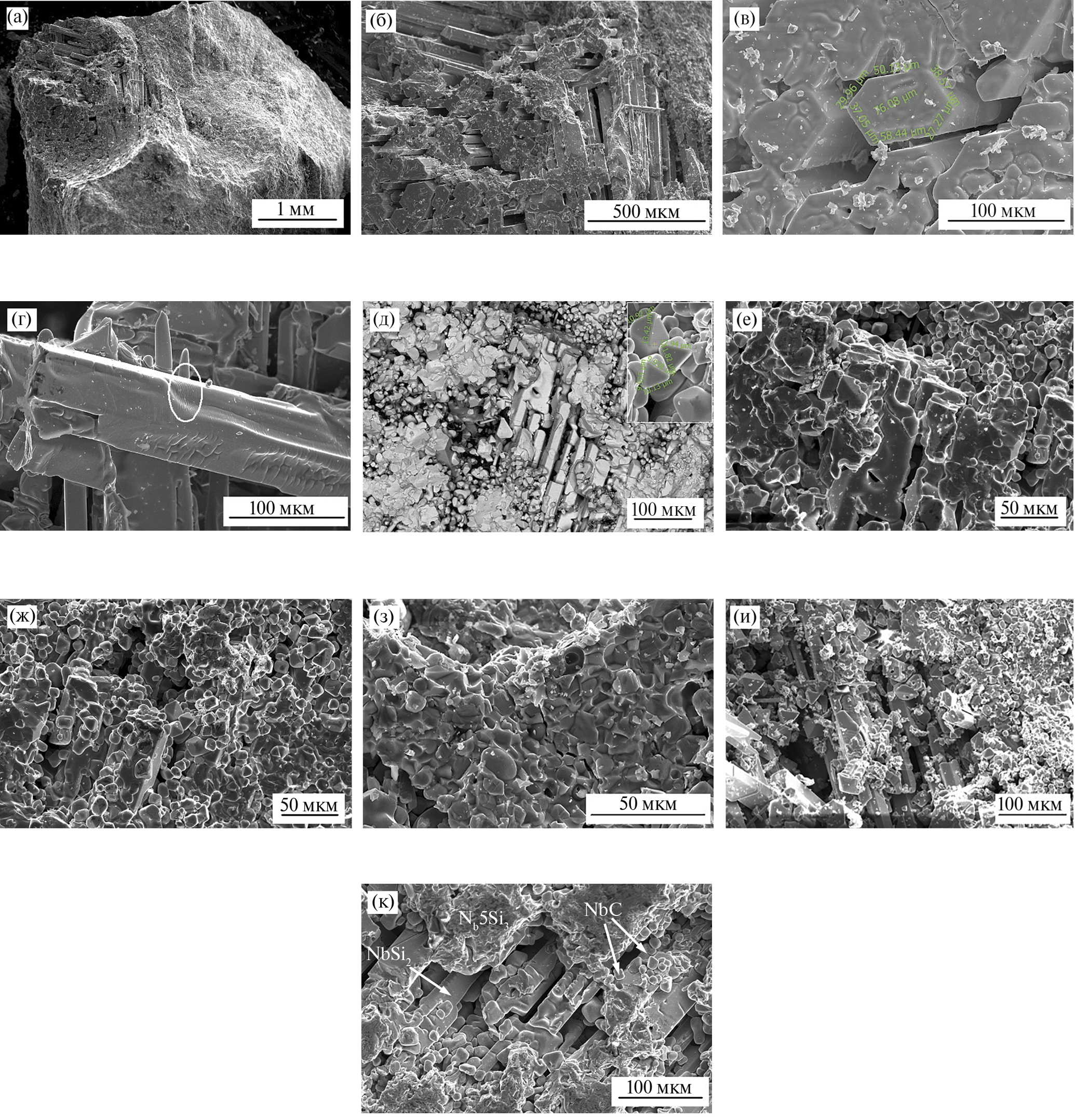 Обратим внимание на размытый вид вытянутых протяженных частиц NbSi2 (рис. 2в, 2г) и некоторых карбидных частиц NbC (рис. 2е–2и). Наиболее вероятно, что подобный вид можно объяснить присутствием жидкой фазы в процессе синтеза композита, плавлением и быстрым затвердеванием. На рис. 2г характерный рельеф выделен овалом. Температура плавления NbSi2 составляет – 1940°С, карбида NbC – 3500–3900°С. То есть температура фронта горения в процессе СВ-синтеза была не менее 3500°С.