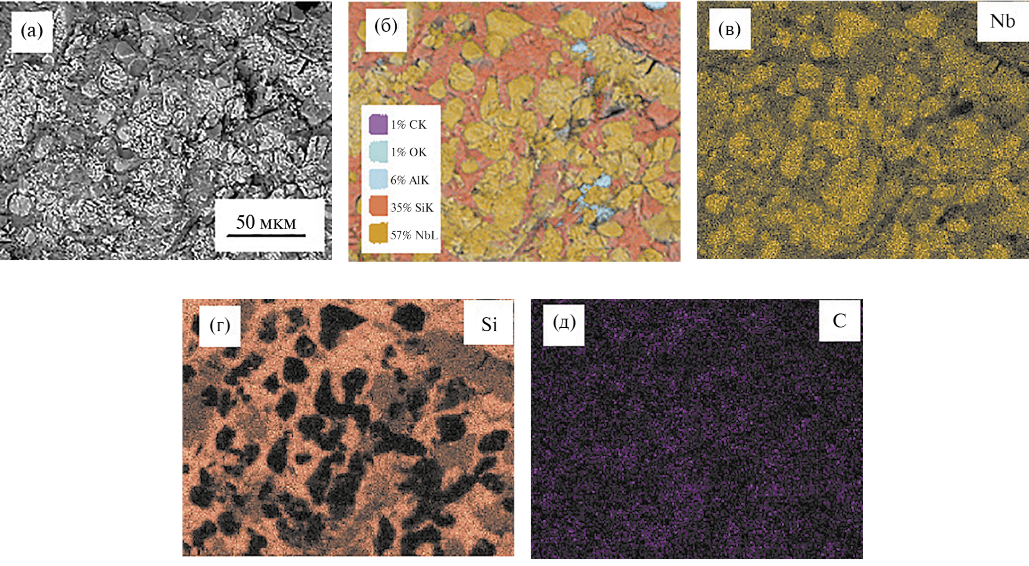 С целью идентификации частиц проведен локальный рентгеноспектральный анализ отдельных участков поверхности. Исследования показали, что пирамидальные/округлые частицы, составляющие большую часть объема, соответствуют частицам карбида ниобия NbC. Зерна карбида NbC окружены силицидами. Вытянутые частицы стержневидной формы имеют максимальное содержание кремния и соответствуют силициду NbSi2. Частицы с меньшим содержанием Si, не имеющие определенной формы, представляют собой силицид ниобия Nb5Si3. Распределение карбида NbC и силицидов Nb5Si3, NbSi2 хорошо видно на рис. 2к. Карты распределения Nb, Si и С, приведенные на рис. 3, подтверждают разную концентрацию составляющих фаз на отдельных участках.