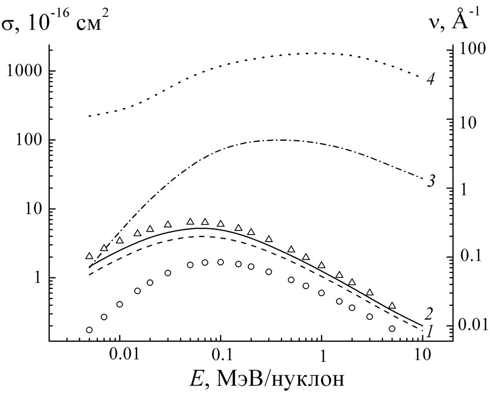 Рис. 1. Зависимость от энергии ионов сечения ионизации атома кремния (1–3) и максимального количества электронно-дырочных пар νmax(Z, E) на единице длины трека ионов 24Mg в ЛПЭ-приближении (4): 1 – p-Si в газах Сgs(E, ε0) = 1 в (3), 2 – p-Si в твердой мишени Сgs(E, ε0) > 1 в (3), 3 – 24Mg–Si в твердой мишени. Приведены экспериментальные данные [16] для сечения ионизации протонами в неоне (o) и аргоне (Δ).
