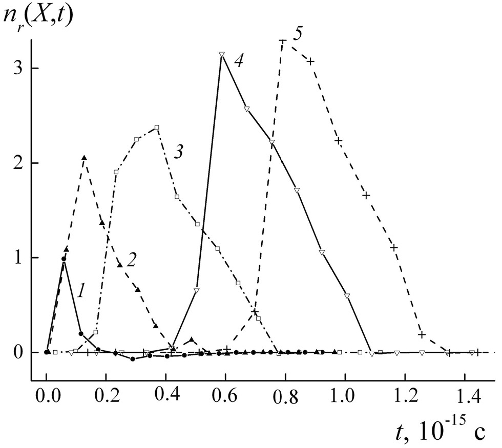 Рис. 8. Изменение во времени количества электронов, пролетающих через поверхность на глубине X, при прохождении ионов 24Mg с энергией E = = 0.5 МэВ/нуклон мишени из кремния толщиной d = 100 Å, глубина: 1 (1); 5 (2); 20 (3); 50 (4); 70 Å (5).