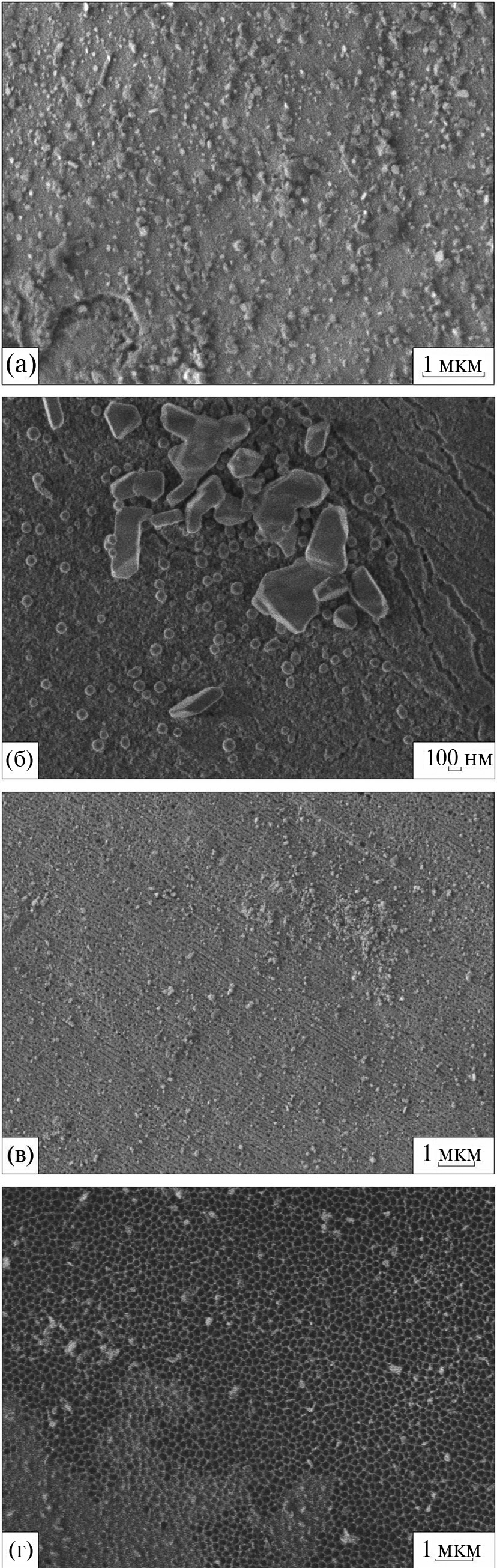 На рис. 1 представлены характерные РЭМ- изображения частиц висмута на нанопористых подложках. Поверхностный слой анодированного оксида алюминия был частично удален с подложки № 2. Вследствие этого были получены участки с “закрытыми” (“З”) (рис. 1б) и “открытыми” (“О”) (рис. 1в) порами диаметром 20–100 нм. На подложке № 3 (рис. 1г) образовался слой анодированного оксида алюминия с диаметром пор 60–220 нм. Толщина слоя для подложек № 1, 2 и 3 составила 14, 15 и 3 мкм соответственно.