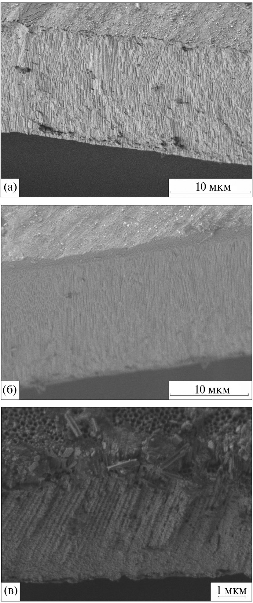 При испарении расплава висмута в среде аргона на анодированном слое формировались сферические наночастицы размерами 20–100 нм и микрочастицы висмута размерами 110–330 нм, также кристаллиты отличной от сферической формы размерами 40–910 нм. Частицы распределялись равномерно по поверхности слоя анодированного оксида алюминия образца № 1 (рис. 1а). Для подвергавшихся травлению подложек № 2 и 3 характерно неравномерное расположение частиц на поверхности анодированного слоя (рис. 1б–г). На рис. 2 показаны характерные РЭМ-изображения скола нанопористых подложек. Благодаря различным условиям получения характер расположения и размеры пор в слое анодированного оксида алюминия были различны для всех образцов.