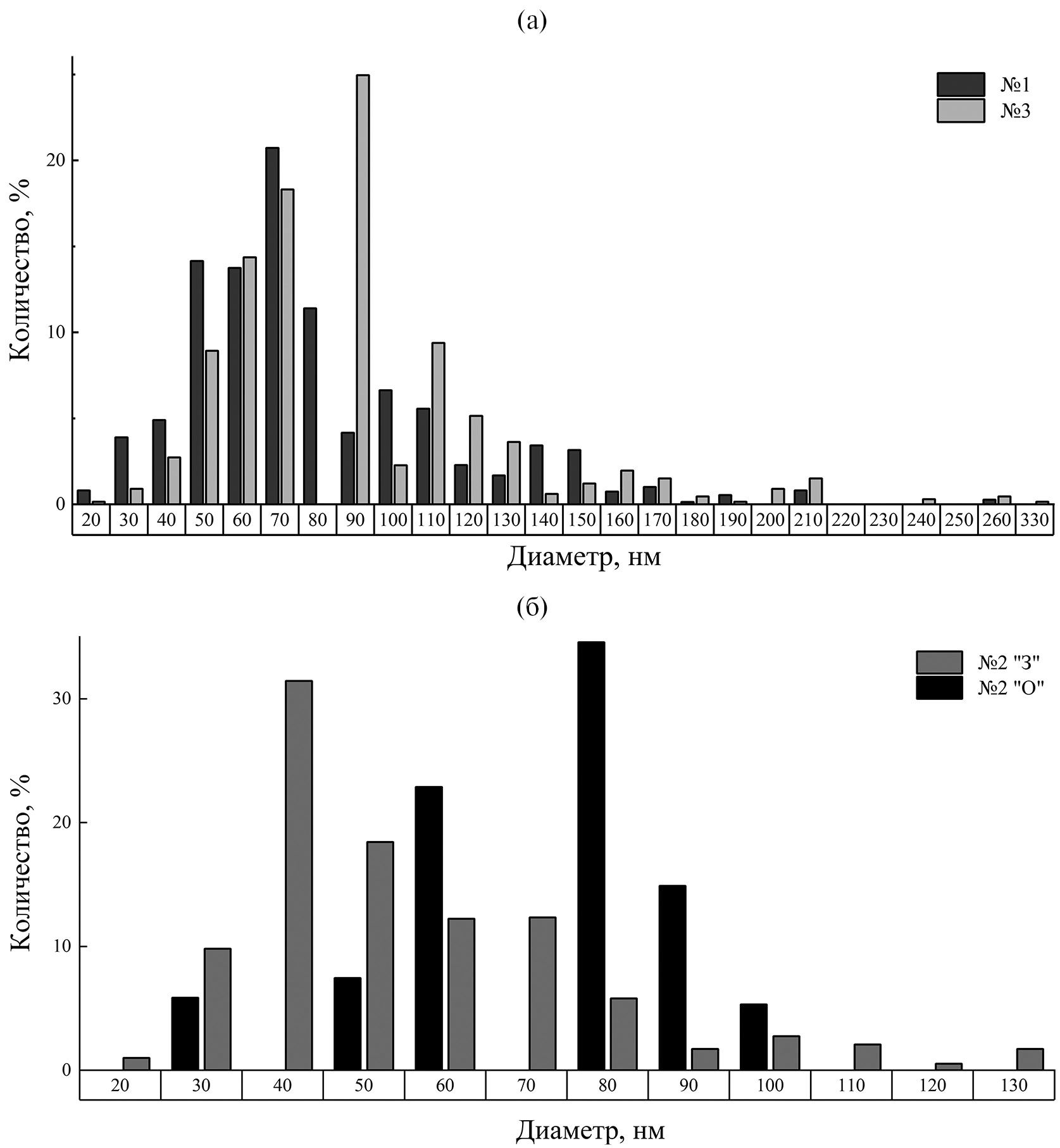 Рис. 3. Диаграммы распределения частиц висмута по размерам для образцов: а – № 1 и № 3; б – № 2 “З” и № 2 “О”.
