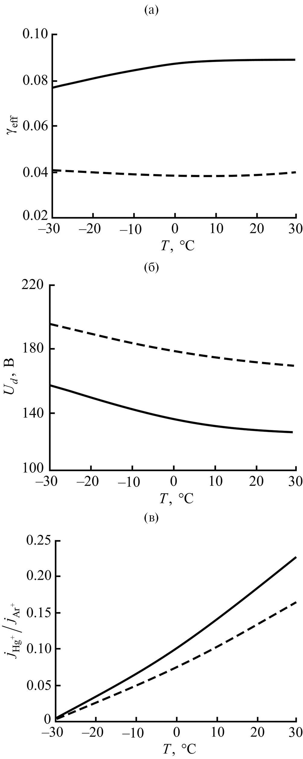 Рис. 1. Зависимость от температуры эффективного коэффициента ионно-электронной эмиссии катода (а), напряжения зажигания разряда (б) и отношения плотностей тока ионов ртути и аргона у катода (в). Сплошные линии соответствуют катоду с пленкой, а штриховые – без пленки.