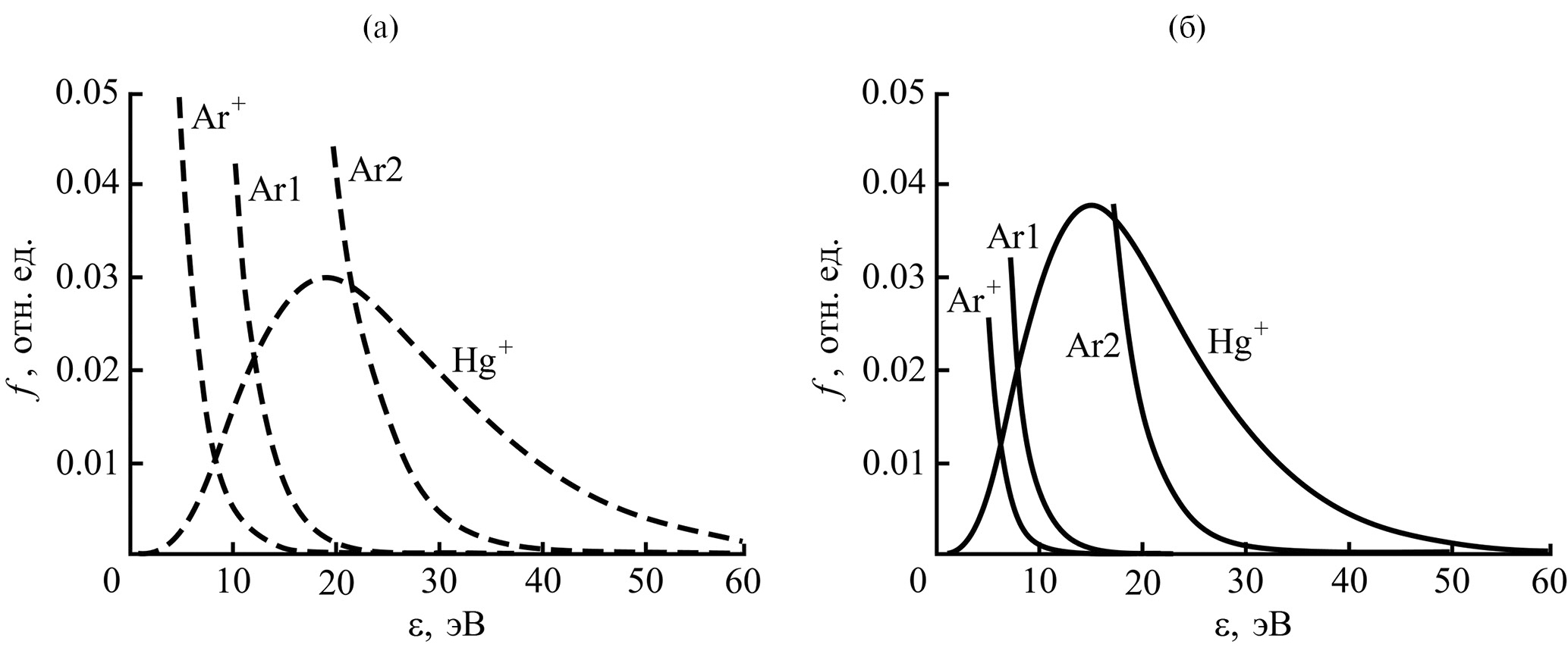 Рис. 2. Энергетические распределения у катода потоков ионов аргона (Ar+) и ртути (Hg+), а также быстрых атомов аргона, возникающих при упругом рассеянии ионов аргона и ртути на медленных атомах аргона (Ar1) и (Ar2) в отсутствие на катоде диэлектрической пленки (а) и при ее наличии (б).