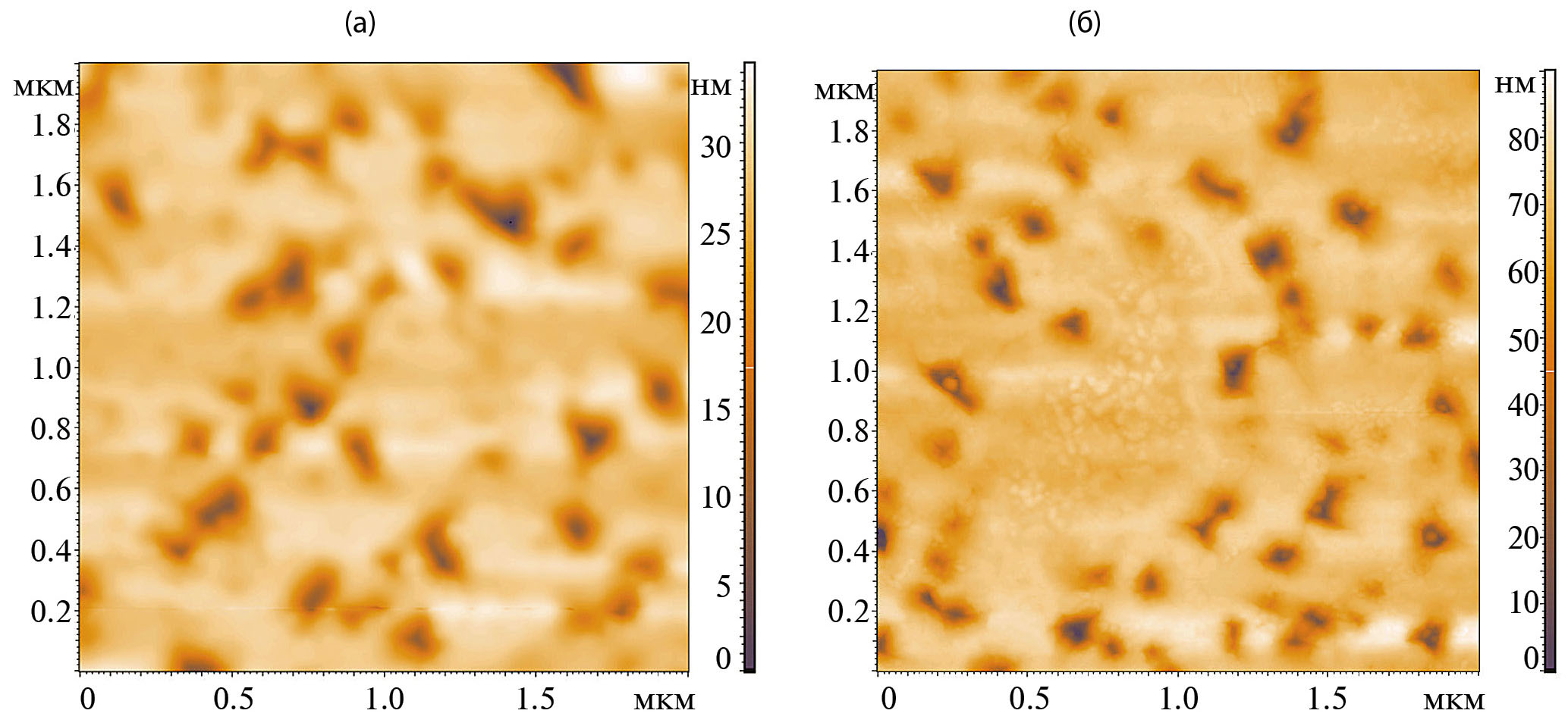 На рис. 1 представлена морфология пленок, выращенных методом МЛЭ (образцы E и F).При росте пленок методом МЛЭ и толщине, сравнимой с толщиной на образце С (табл. 1), пленка на образце E характеризуется развитием проколов глубиной 10–15 нм (на всю толщину) и плотностью до 1 × 107 см–2 (рис. 1а), между которыми части пленки с размерами 0.5–1.0 мкм выглядят гладкими, что соответствует сросшимся зернам силицида с плоской поверхностью. Это свидетельствует о трехмерном механизме роста с последующей коалесценцией и кристаллизацией при силицидообразовании в процесс МЛЭ-роста. Образец F обладает еще большей шероховатостью и большими размерами и глубиной проколов (рис. 1б) за счет увеличения времени осаждения и толщины пленки силицида, что увеличивает ее шероховатость (табл. 1). Пленка также характеризуется плоскими участками между проколами, что подтверждает коалесценцию и кристаллизацию при трехмерном механизме роста.