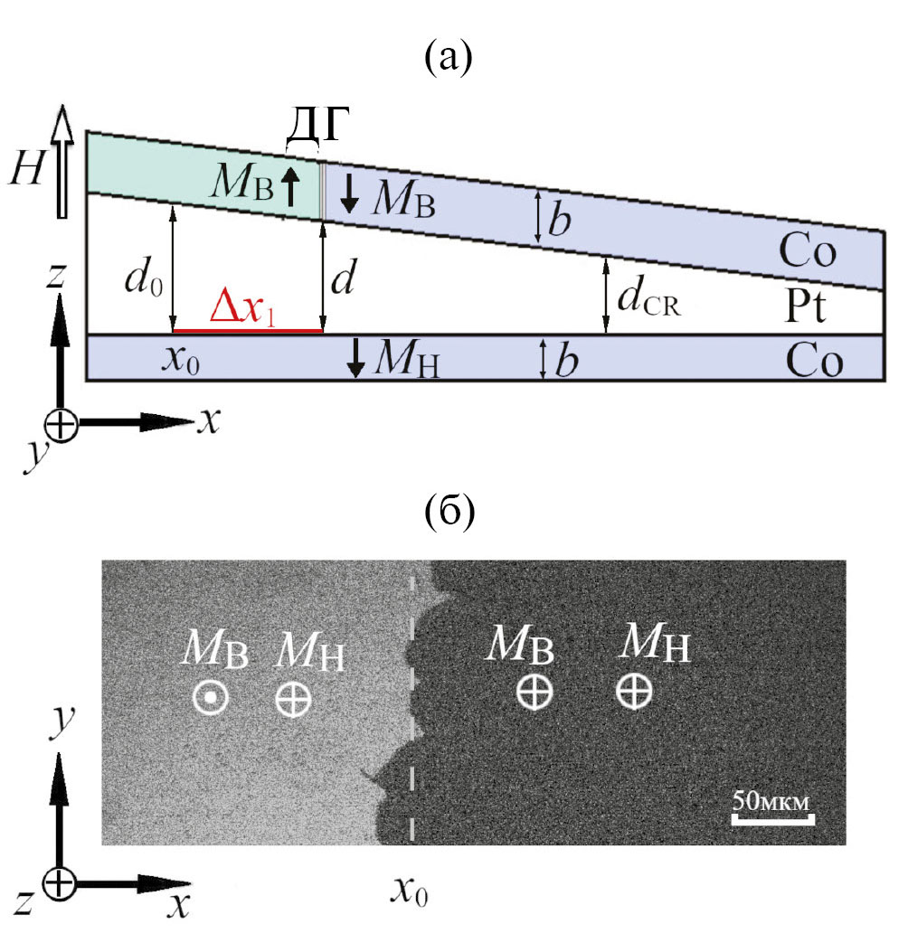 Слои Pt(10 нм)/Co(0.6 нм)/Pt(d)/Co(0.6 нм)/Pt(3 нм) были нанесены магнетронным распылением на окисленную кремниевую подложку площадью 5 × 6 мм при комнатной температуре. Толщина прослойки платины d равномерно изменялась вдоль стороны клина от 5 до 6 нм (рис. 1а). Формирование и эволюция доменов были изучены с использованием полярного эффекта Керра в поляризационном микроскопе в диапазоне температур от 200 до 300 К. Магнитооптические изображения доменной структуры регистрировали CCD-камерой, а затем обрабатывали и анализировали. Для увеличения магнитооптического контраста получаемых изображений, из каждого из них вычитали базовое изображение, полученное в результате сложения и деления на 2 двух изображений образца, намагниченного до насыщения в полях противоположной полярности. Чтобы исключить при измерениях смещения доменной границы в одном из ФМ слоев влияние на ее кинетику доменной границы в другом ФМ слое использовали импульсное магнитное поле [23]. С одной стороны, длительность импульса поля выбирали такой, чтобы в течение его действия граница в более коэрцитивном слое, если таковая уже возникала, не успевала сместиться к наблюдаемой границе, движущейся в менее коэрцитивном слое. С другой стороны, времена между импульсами выбирали такими, чтобы доменная граница, смещающаяся в градиентном поле, не успевала сместиться назад на сколько-нибудь значимое расстояние. Значения полей коэрцитивности HC1 и HC2 были получены из измерений полей старта (соответствующих началу движения доменных границ) для границ в каждом из слоев кобальта. Наличие различий коэрцитивной силы в нижнем и верхнем слоях позволяет наблюдать при перемагничивании некогерентное зарождение доменов и несогласованное движение их границ в этих слоях при магнитооптической визуализации доменной структуры.