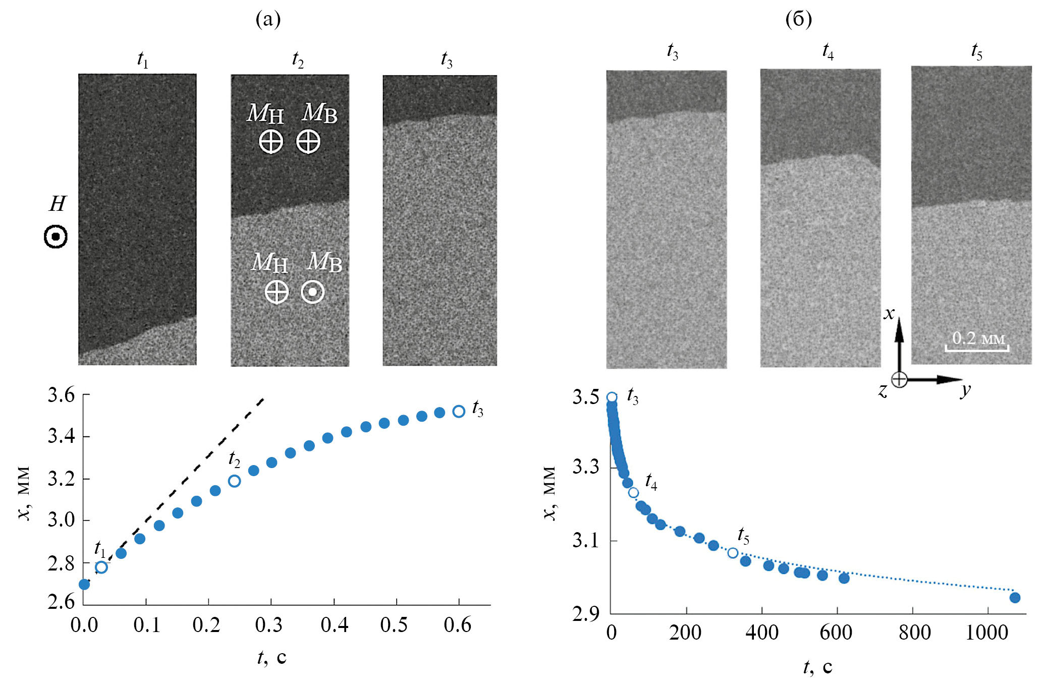 Рис. 2. Магнитооптические изображения и зависимость перемещения доменных границ от времени вдоль клина Pt: a – в результате действия последовательности импульсов магнитного поля с амплитудой 88 Э и длительностью τ = 4 мс; б – в процессе релаксации доменных границ после прекращения действия поля.