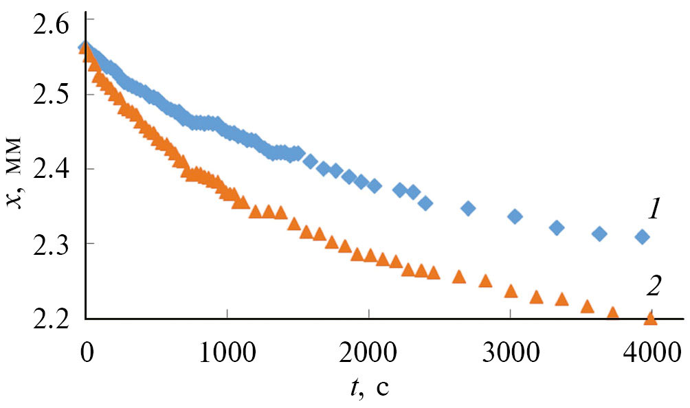 Рис. 3. Зависимость релаксации доменных границ после прекращения действия поля при температуре 270 (1) и 260 К (2).