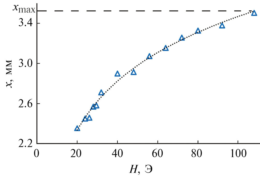 На рис. 4 приведена зависимость установившегося равновесного положения доменной границы x при ее смещении вдоль клина (рис. 1a) после приложения при комнатной температуре отдельных серий импульсов (от 5 до 9 импульсов в серии) магнитного поля с фиксированной амплитудой в каждой серии. Зависимость х(Н) оказалась существенно нелинейной, стремящейся к насыщению в положении x = xmax (рис. 4) при увеличении амплитуды поля. Поскольку при приложении магнитного поля Н, превышающего поле коэрцитивности нижнего слоя HC2, в нижнем слое зарождались домены обратной намагниченности, то длительность импульса τ = 4 мс подбирали таким образом, чтобы граница в верхнем слое опережала границу в нижнем слое. Дистанция между положениями границ в ФМ слоях была много больше ширины границ, что позволяло считать их движения независящими друг от друга. И лишь вблизи положения x = xmax смещения границ в обоих ФМ слоях сравнивались. После достижения границей в верхнем слое области с x ≥ xmax ее дальнейшее независимое продвижение при увеличении амплитуды импульсов магнитного поля прекращалось, и она оставалась в этом положении до тех пор, пока с увеличением амплитуды поля не начиналось согласованное связанное перемещение пары доменных границ в обоих слоях.