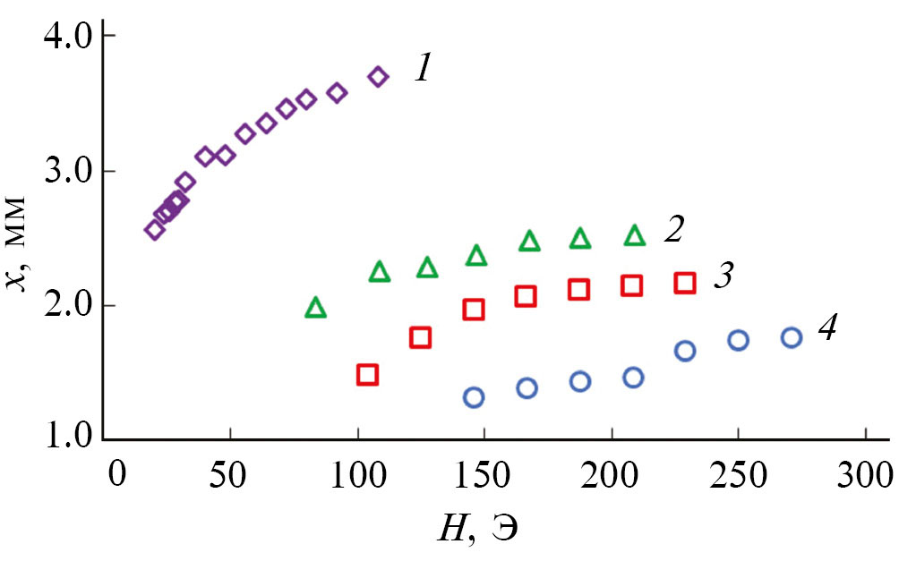 Рис. 5. Зависимости смещения доменной границы от величины магнитного поля при температуре 293 (1); 260 (2); 240 (3) и 220 К (4).