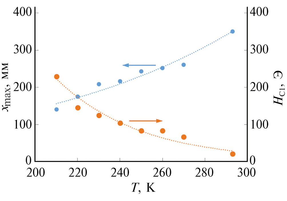 Рис. 6. Зависимости величины максимального смещения и коэрцитивности верхнего слоя от температуры, полученные из данных семейства кривых x(H), представленных на рис. 5.