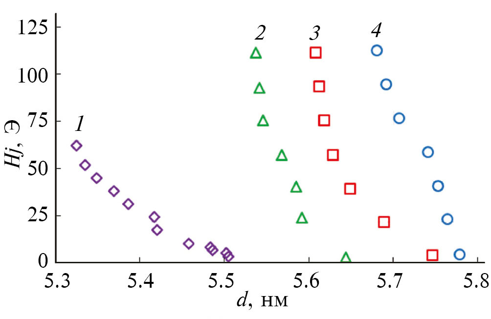 Из приведенных результатов следует, что выявленная стабилизация доменной границы в верхнем слое при достижении ею положения xmax с толщиной прослойки dCR зависит как от величины эффективного поля HJ , так и от величины коэрцитивного поля HC1.