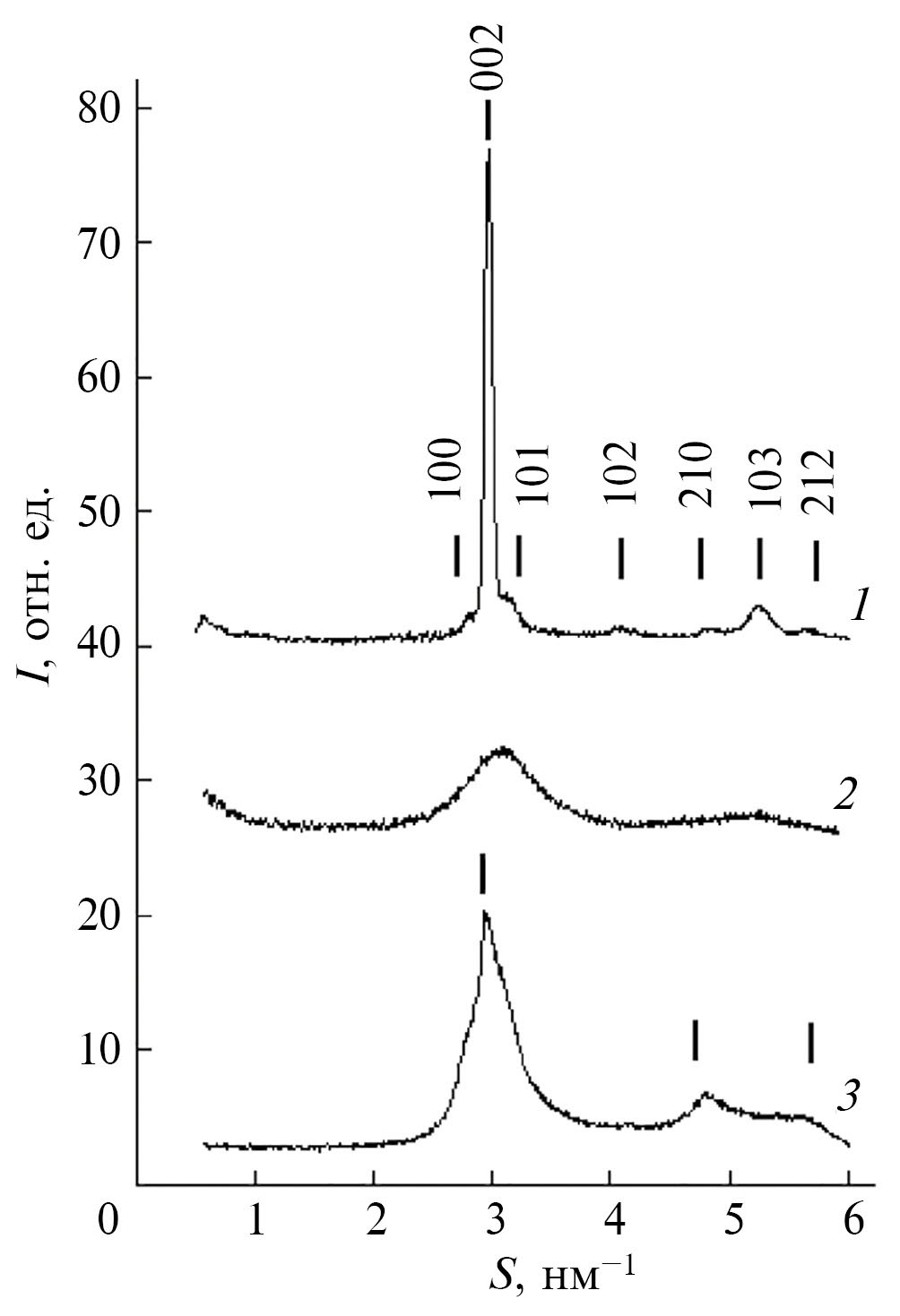 Однокомпонентные пленки ППК и CdS. На рис. 1, 2 приведены дифрактограммы однокомпонентных пленок CdS и ППК. Судя по полученным дифрактограммам (рис. 1), CdS в таких пленках может иметь кристаллическую структуру типа вюрцита со средним размером ОКР L002 ≈ 60 нм, дефектную кристаллическую СПУ-структуру со средним размером ОКР ∼9 нм, рассчитанным по ширине дифракционного пика при S ≈ 3 нм–1 (рис. 1, кривая 3) после отделения прилежащих к нему слева и справа двух более слабых пиков, или может быть рентгеноаморфным (рис. 1, кривая 2) и состоять в этом случае, по мнению авторов [10], из аморфных частиц, размер которых не превышает ~3 нм. Отметим, что дифрактограммы рентгеноаморфных веществ, подобные представленной на рис. 1 (кривая 2), возможны как для низкоупорядоченных частиц большого размера, так и для кристаллических частиц очень малого размера (~1 нм) [21]. Поэтому определение размеров частиц CdS по таким дифрактограммам неоднозначно.