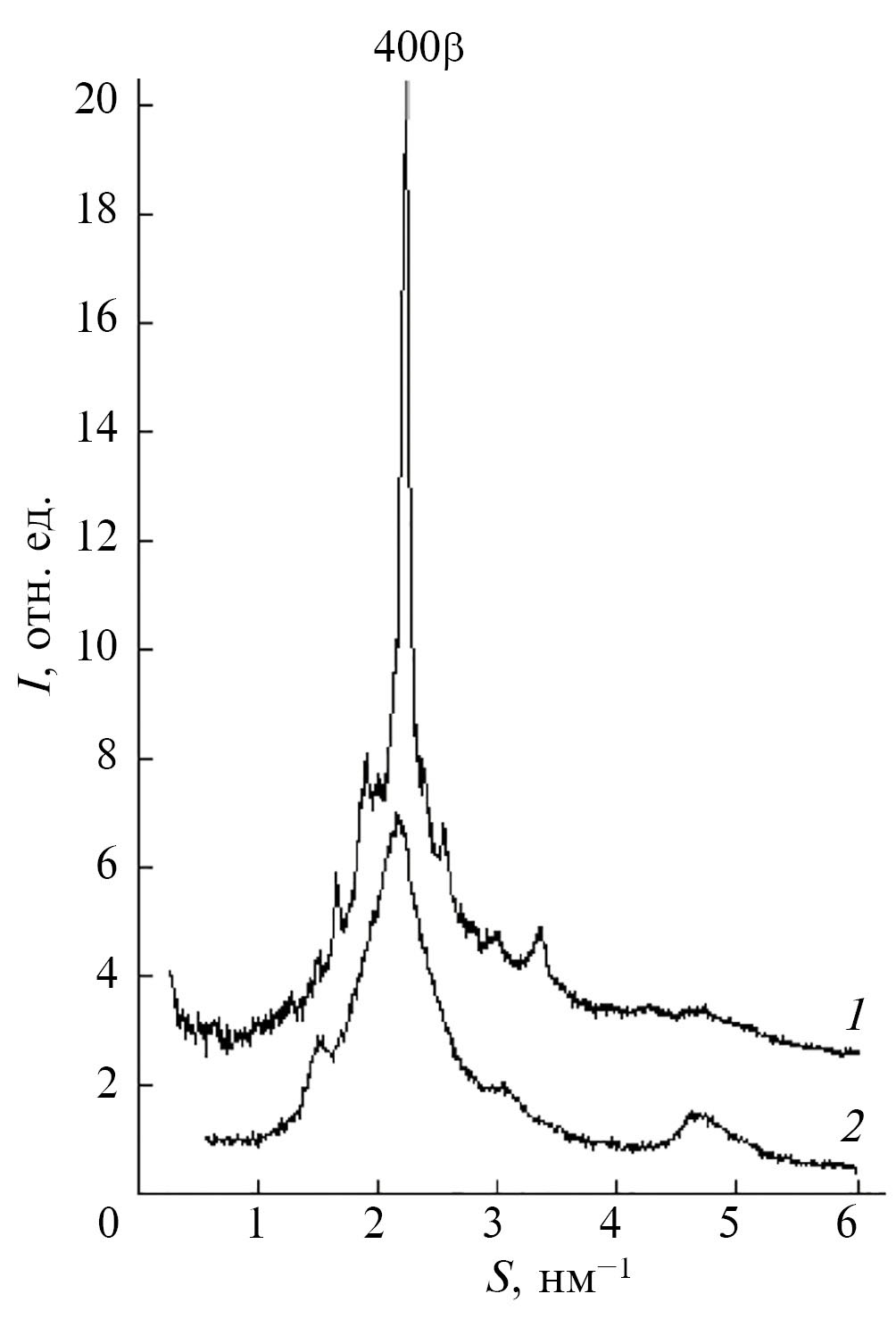 Дифрактограммы пленок ППК (рис. 2), а также данные других авторов [22–24], показывают, что эти пленки могут быть как аморфно-кристаллическими, так и рентгеноаморфными. Так, пленка ППК (рис. 2, кривая 1) имеет аморфно-кристаллическую структуру. Ее кристаллическая часть в основном состоит из β-формы ППК (гексагональная элементарная ячейка, a = 2.052 нм, c = 0.658 нм) [13]. В то же время пленка ППК, на дифрактограмме которой наблюдаются диффузные пики (рис. 2, кривая 2), рентгеноаморфная [13]. Пики при S ≈ 2.2 и 4.7 нм–1 характерны для рентгеноаморфного ППК, а пики при S ≈ 1.5 и 3.0 нм–1 могут быть вызваны образованием в пленке низкомолекулярных соединений (циклических олигомеров) [22, 25].