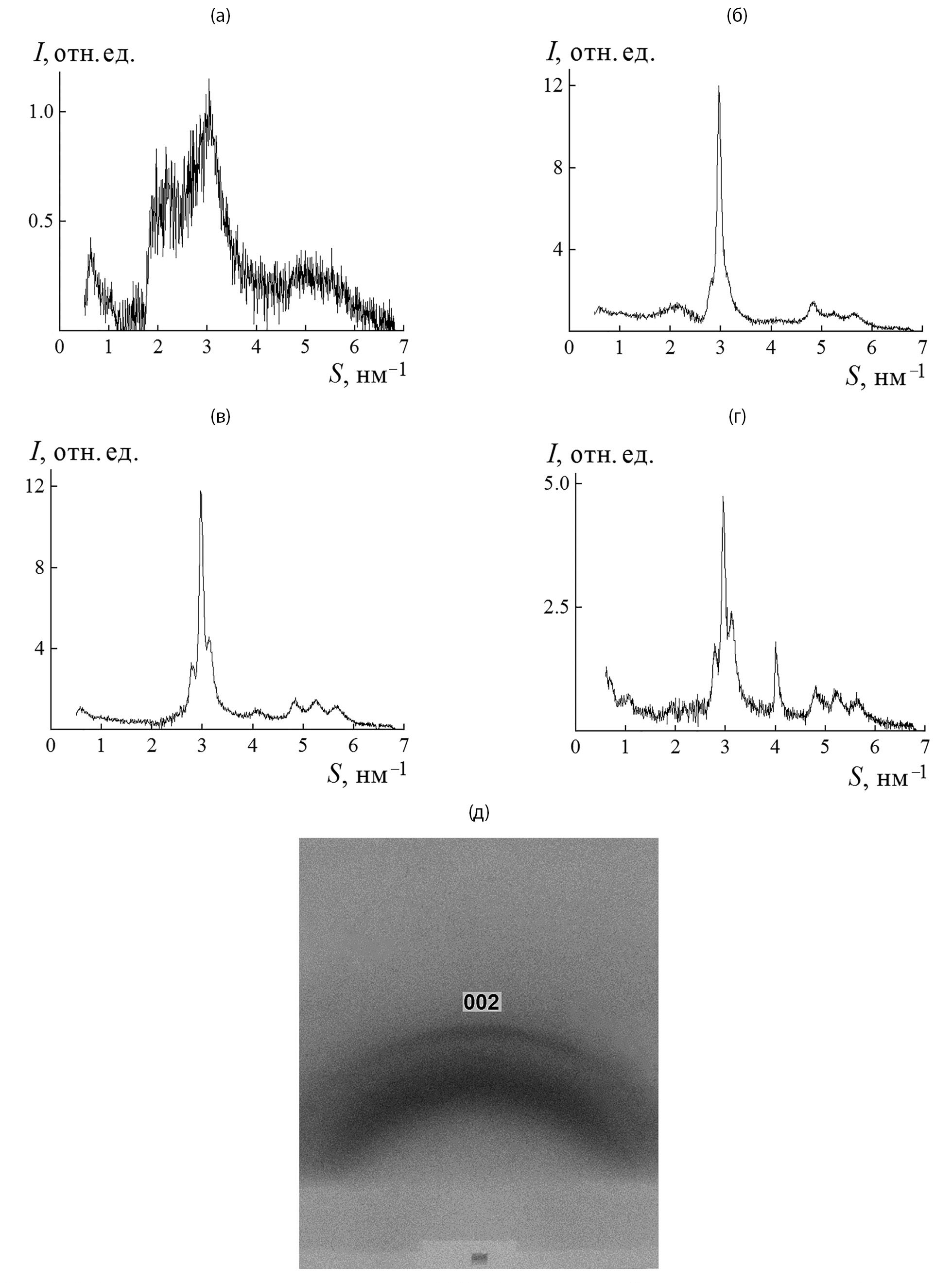 Рис. 4. Дифрактограммы пленок нанокомпозитов ППК–CdS толщиной ~0.2 мкм, полученные на лабораторном дифрактометре с координатным детектором (a–г) и фотометодом с помощью рентгеновской камеры с точечной коллимацией рентгеновского пучка (д), содержание наполнителя CdS: a – 8; б – 10.5; в – 11; г – 13.5; д – 10.5 об. %.