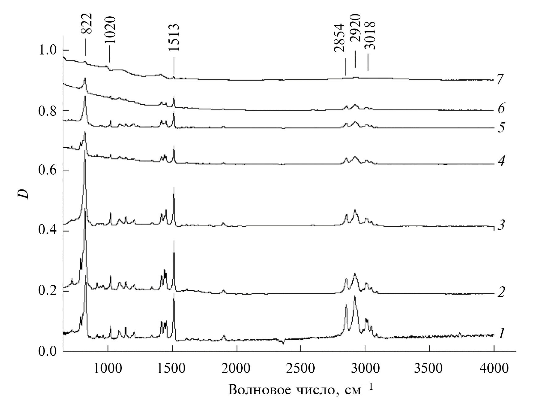 Рис. 5. ИК-спектры пленок нанокомпозитов ППК–CdS толщиной ~1.5 мкм с концентрацией наполнителя CdS: 1 − 0; 2 − 5; 3 − 10; 4 − 30; 5 − 50; 6 − 60; 7 – 70 об. %.