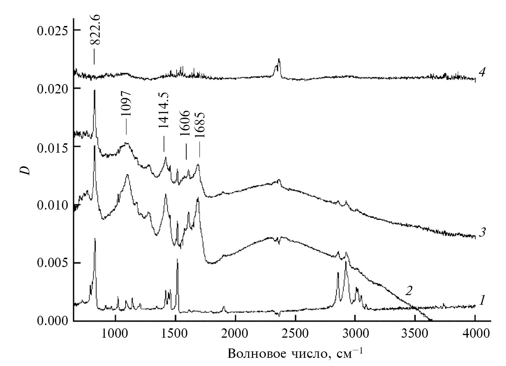 Рис. 6. ИК-спектры пленок нанокомпозитов ППК–CdS толщиной ~0.2 мкм с концентрацией наполнителя CdS: 1 − 0; 2 − 8; 3 − 10; 4 − 10.5%.