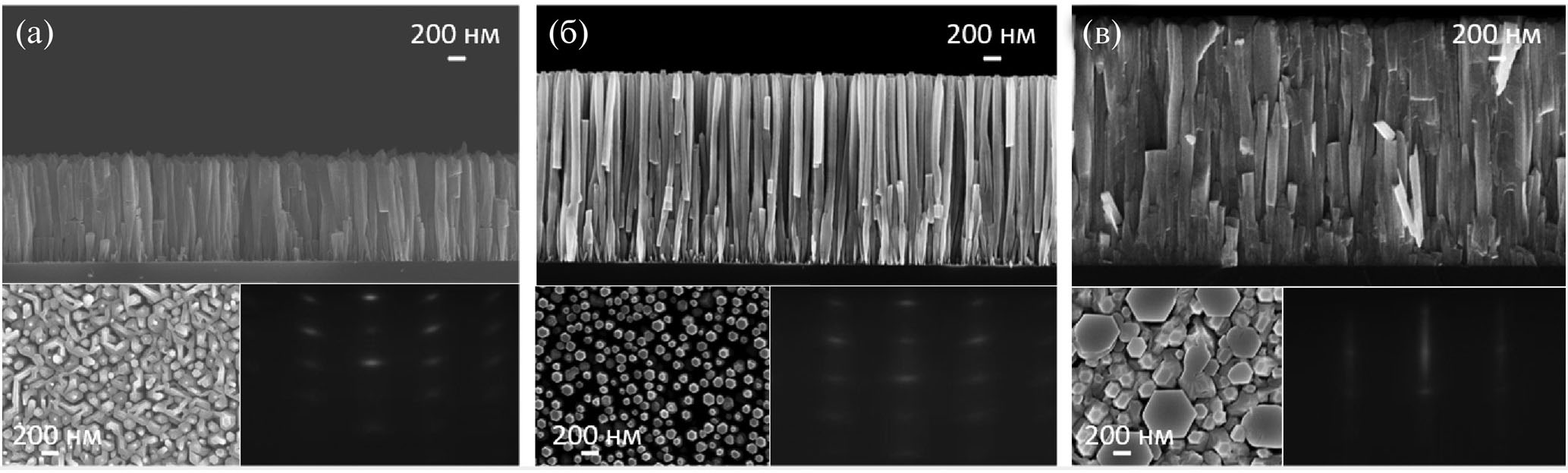 Рис. 1. Типичные РЭМ-изображения образцов, выращенных при суммарных падающих потоках FIII, соответствующих 1.5 (а); 2.0 (б); 5.0 × 10–7 Торр (в) и полученные картины ДБЭ после окончания ростов.