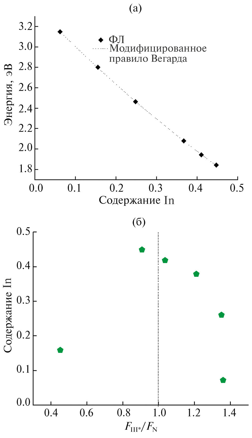 Рис. 3. Зависимость энергии излучения от содержания In в InGaN (а) и зависимость содержания In в InGaN от соотношения потоков FIII*/FN (б).