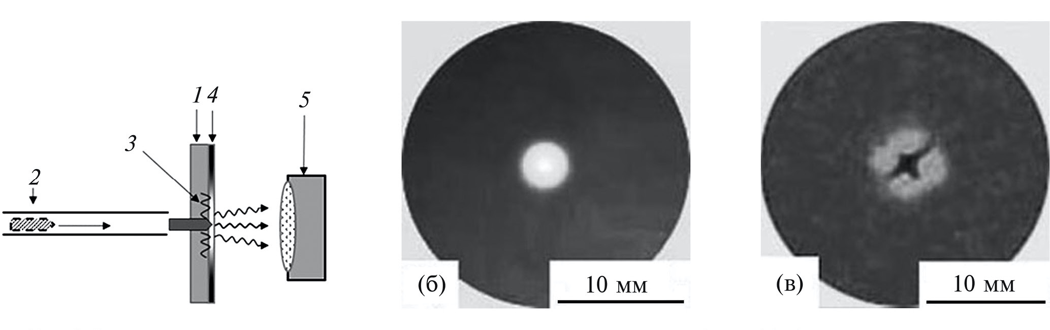 Рис. 5. Схема эксперимента по визуализации механического воздействия на образец (а): 1 – пластина из нержавеющей стали; 2 – боек; 3 – пробивка пластины; 4 – механолюминесцирующий слой; 5 – видеокамера (скорость съемки 50 кадров/с). Визуализация напряжений и деформаций, возникающих при разрушении (пробивке) пластины из нержавеющей стали при ударном воздействии бойка: при ударе бойка до (б) и сразу после пробивки пластины (в)