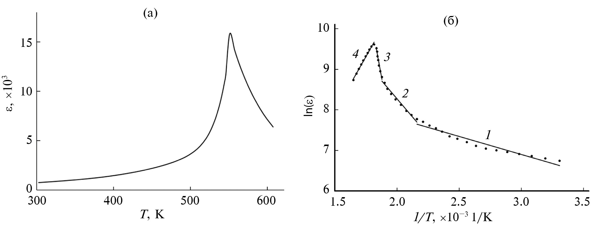 Рис. 1. Зависимость диэлектрической проницаемости от температуры ε(T) (а) и логарифма диэлектрической проницаемости от обратной температуры lnε(1/T) (б) для образцов Pb(Zr0.53Ti0.47)O3; 1–4 – участки графика, аппроксимированные линейной зависимостью