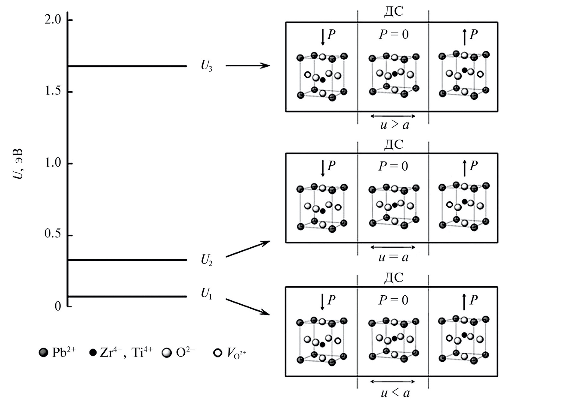 Рис. 2. Энергии активации для температурно-активационных процессов в сегнетоэлектрической фазе, соответствующие линейно аппроксимированным участкам lnε(1/T), и смещения доменных стенок (схематически), закрепленных на кислородных вакансиях VO2+. ДС – доменная стенка, P – поляризация, u – смещение доменной стенки, a – параметр элементарной ячейки