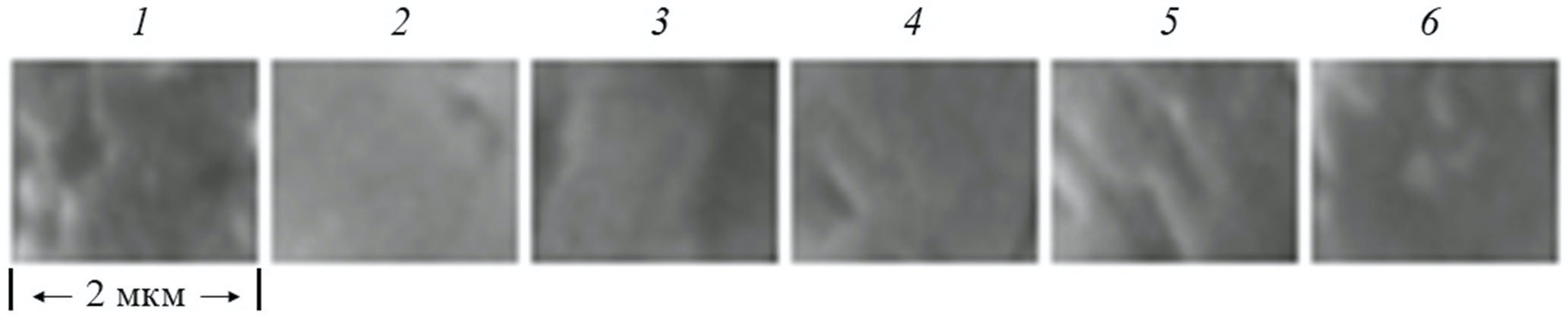 Рис. 3. Морфология поверхности неполяризованного (1), поляризованного (2) и отожженного при температуре 373 (3), 473 (4), 536 (5, соответствует Td), 552 К (6, полностью деполяризованный образец) после поляризации образца Pb(Zr0.53Ti0.47)O3, полученная в режиме на отражение при комнатной температуре