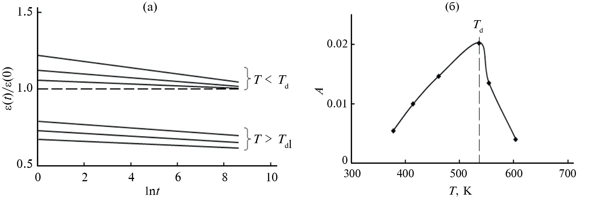 Вторым этапом метода активации–релаксации диэлектрической проницаемости является нагревание сегнетоэлектрика до определенной температуры T с последующей закалкой до комнатной температуры, после чего проводится измерение релаксации диэлектрической проницаемости к равновесному состоянию в течение нескольких часов ε(t). В логарифмическом масштабе времени зависимости ε(t) имеют линейный вид (ε(t) = –Alnt+B). На примере сегнетоэлектрика Pb(Zr,Ti)O3 показано, что отжиг при температуре ниже определенной температуры деполяризации Td < TC приводит к восстановлению диэлектрической проницаемости до значения до отжига. А отжиг при температурах выше температуры Td приводит к уменьшению диэлектрической проницаемости [21]. Для образцов состава Pb(Zr0.53Ti0.47 O3 Td = 536 К, TC = 552 К. Анализ температурной зависимости коэффициента A, характеризующего скорость релаксации диэлектрической проницаемости после закалки к равновесному состоянию, показал наличие максимума ε при температуре Td, что объясняется увеличением подвижности доменной структуры при приближении к точке Кюри TC (рис. 4).