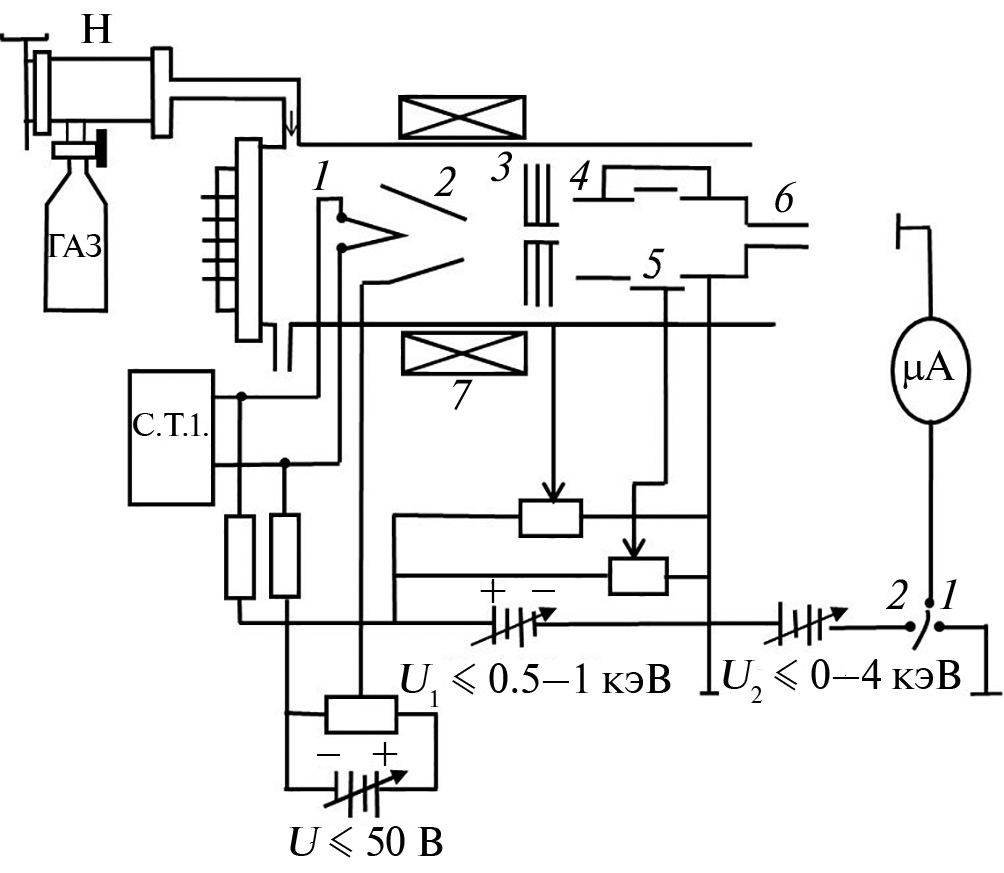 Рис. 1. Конструкция ионной пушки для создания пучка ионов газов: 1 – нить накала; 2 – анод; 3 – система диафрагм; 4–6 – фокусирующие и ускоряющие электроды
