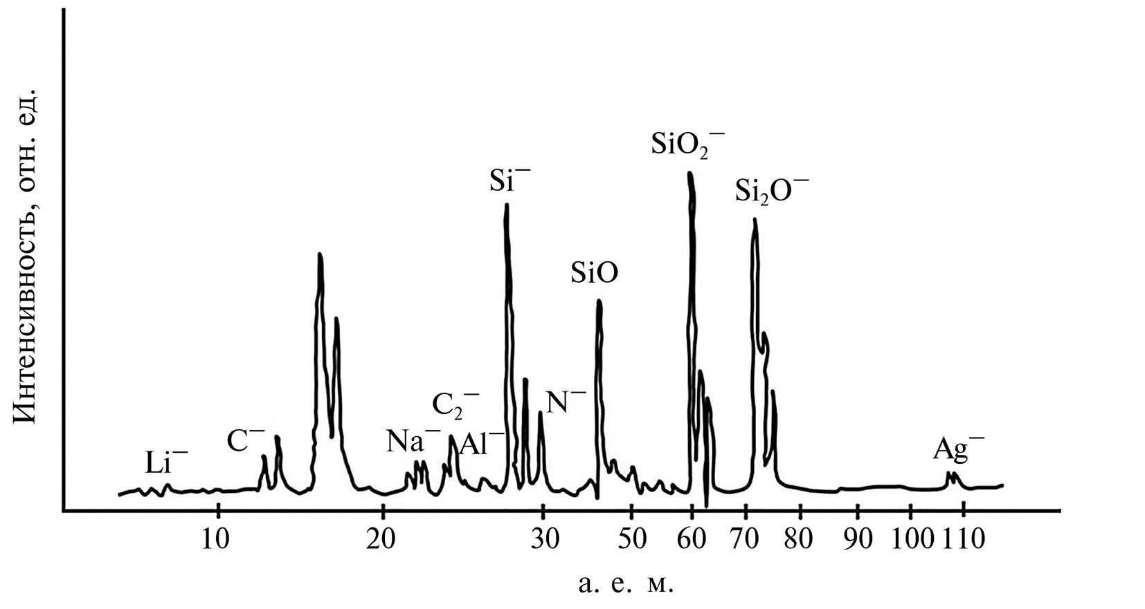 Рис. 2. Масс-спектр Si, имплантированного ионами О2+ с Е0 = 1 кэВ при D = 6 × 1016 см–2, измеренный при бомбардировке ионами Сs+ с Е0 = 6.7 кэВ