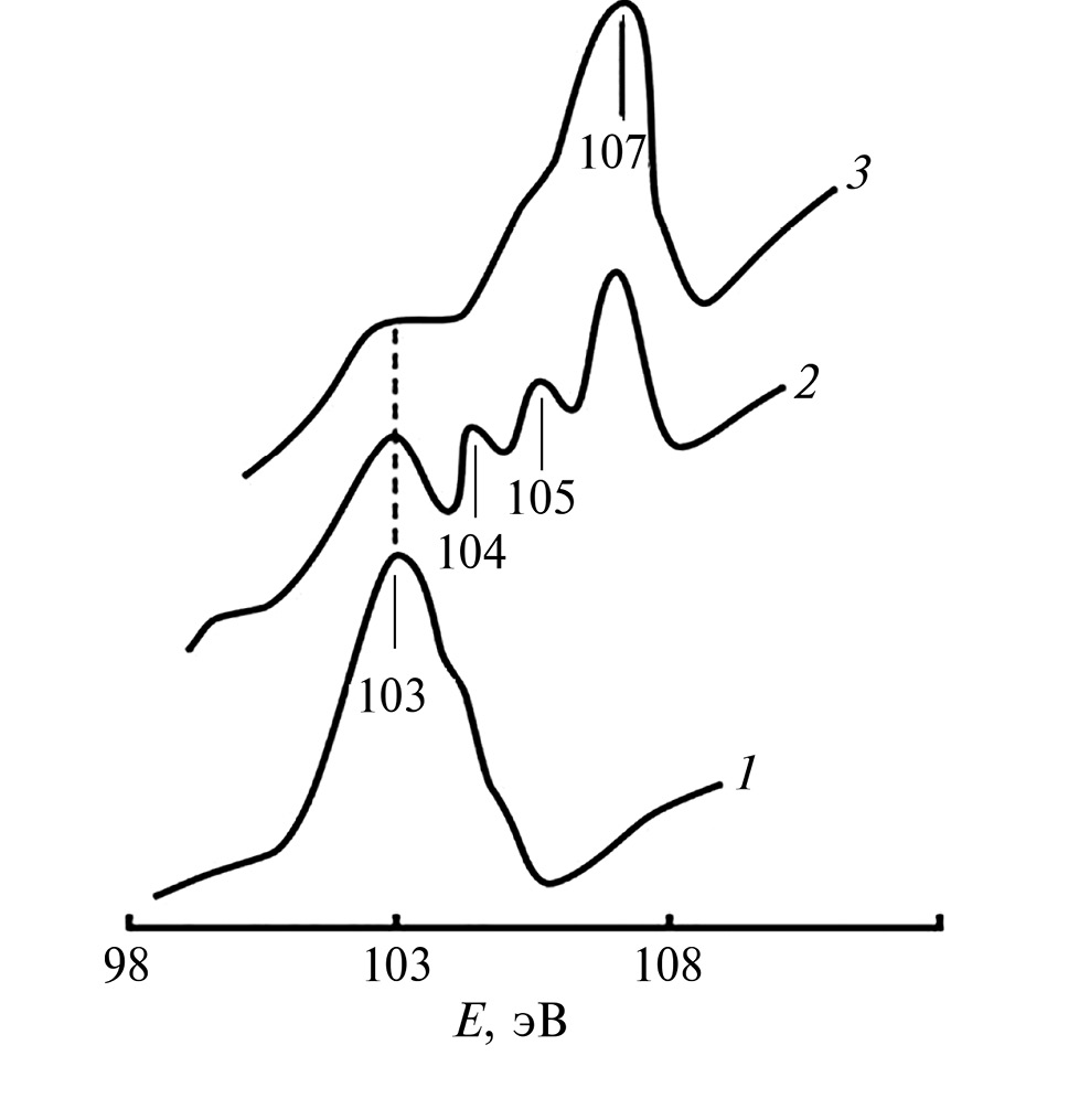 Рис. 3. Спектры упруго отраженных электронов L23VV Si: 1 – чистого; 2 – после имплантации ионов О2+ с Е0 = 1 кэВ и D = 6 × 1016 см–2, 3 – после отжига при 900 К в течение 30 мин