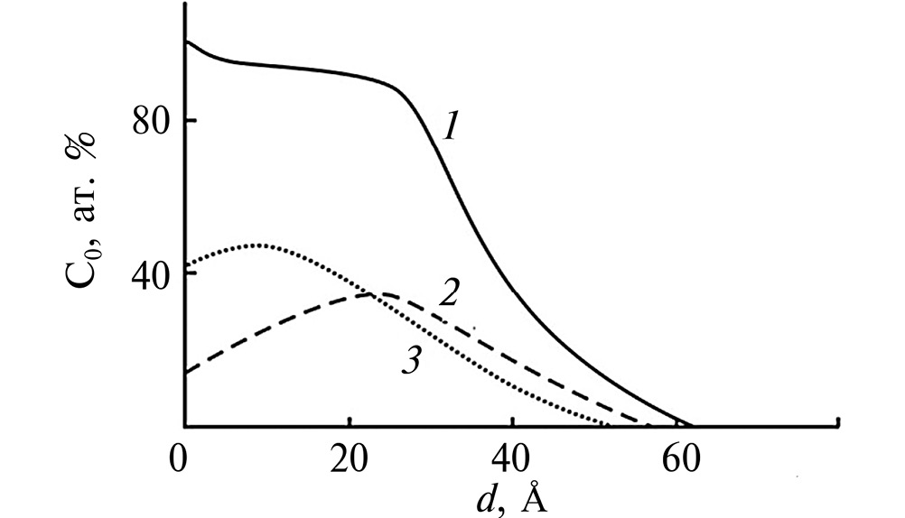 Рис. 4. Зависимости концентрации атомов кислорода СО(d) для Si, имплантированного ионами О2+ с Е0 = 1 кэВ: 1 – общая концентрация; 2 – в оксиде SiО2; 3 – в соединении SiОх(SiО + SiО0.5)